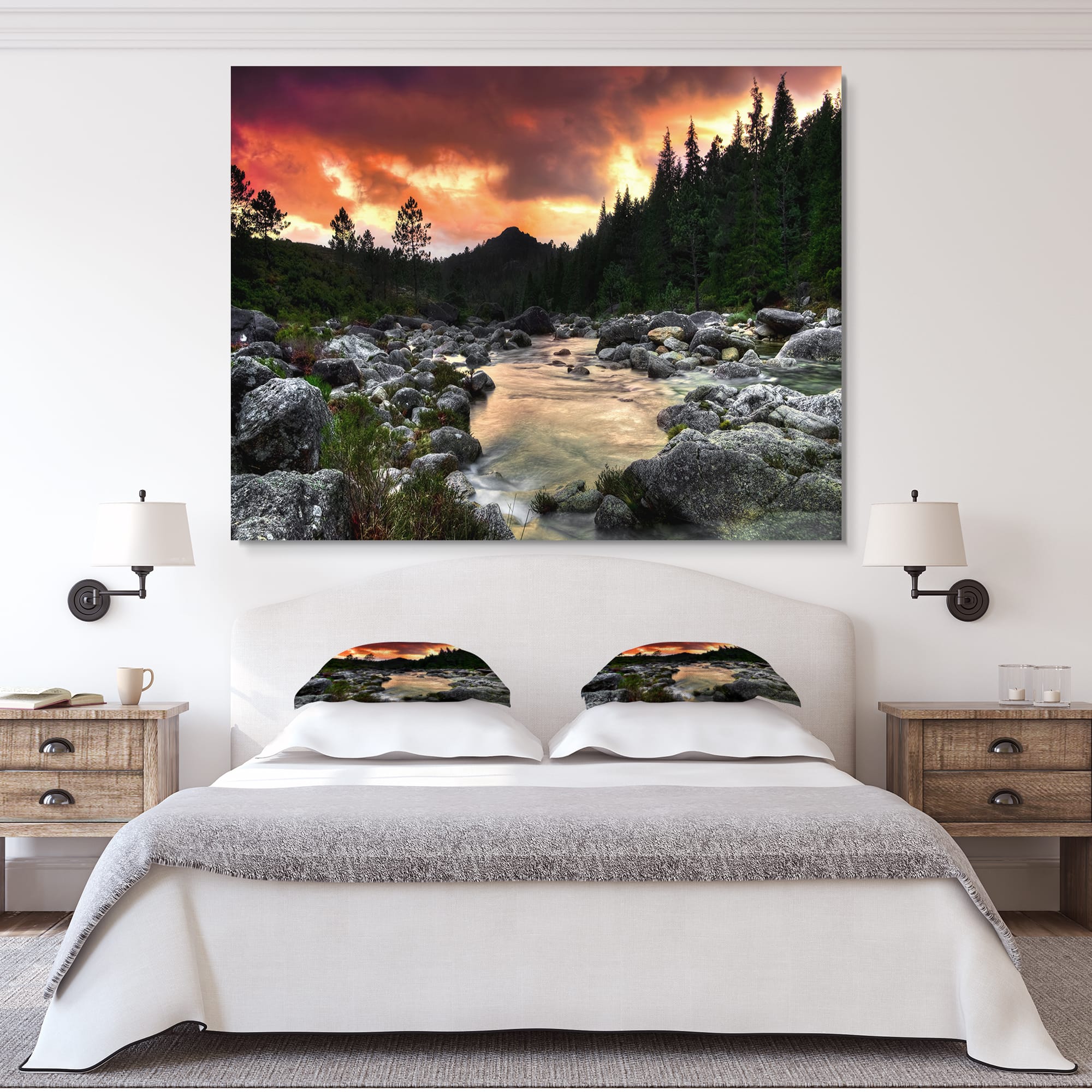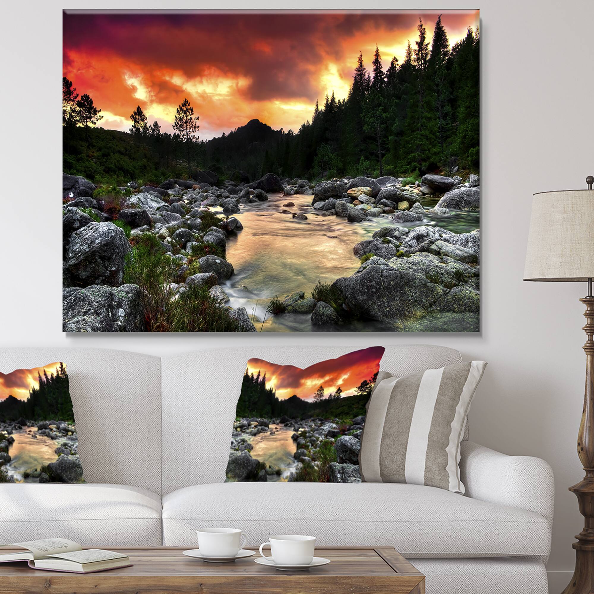 Designart - Rocky Mountain River at Sunset - Extra Large Wall Art Landscape