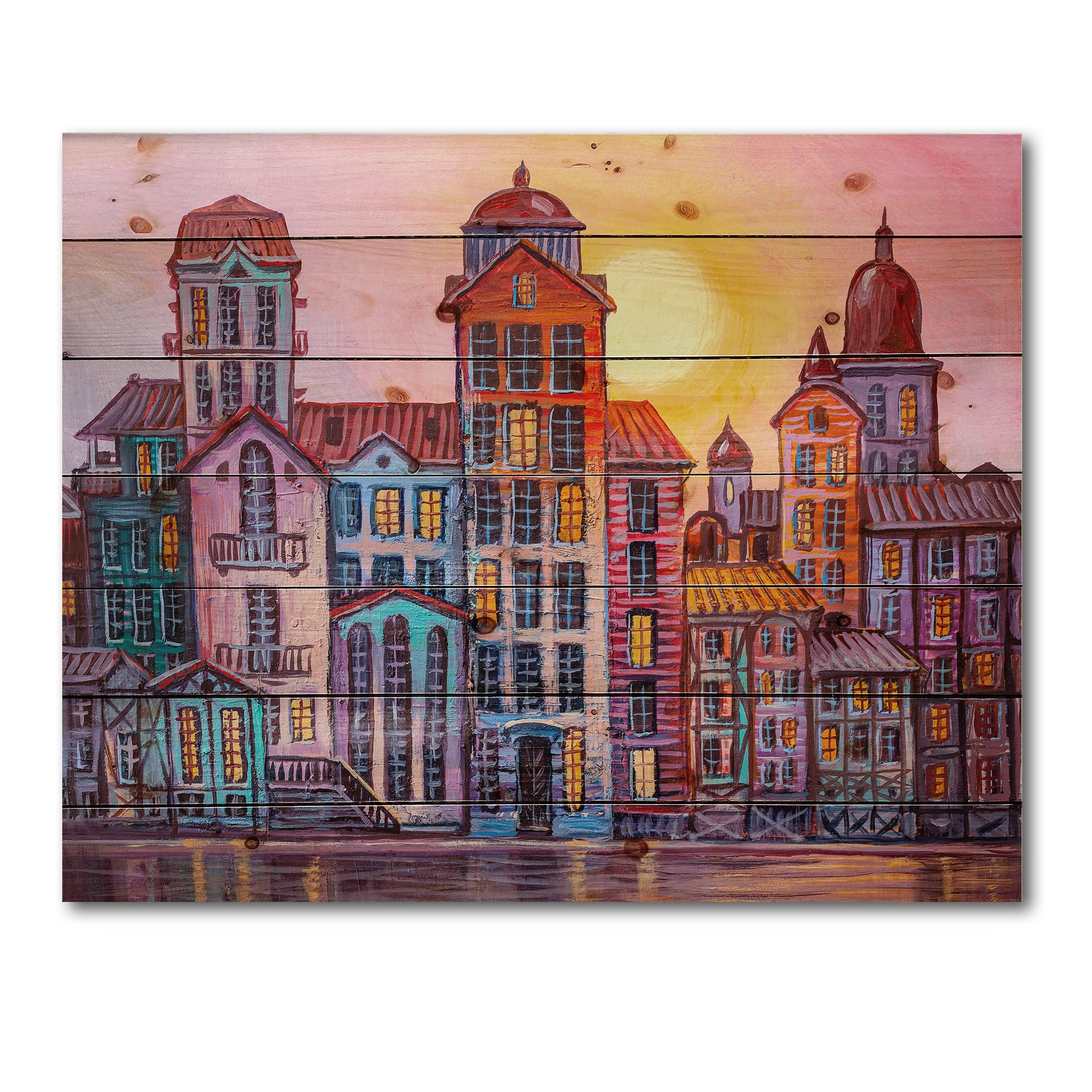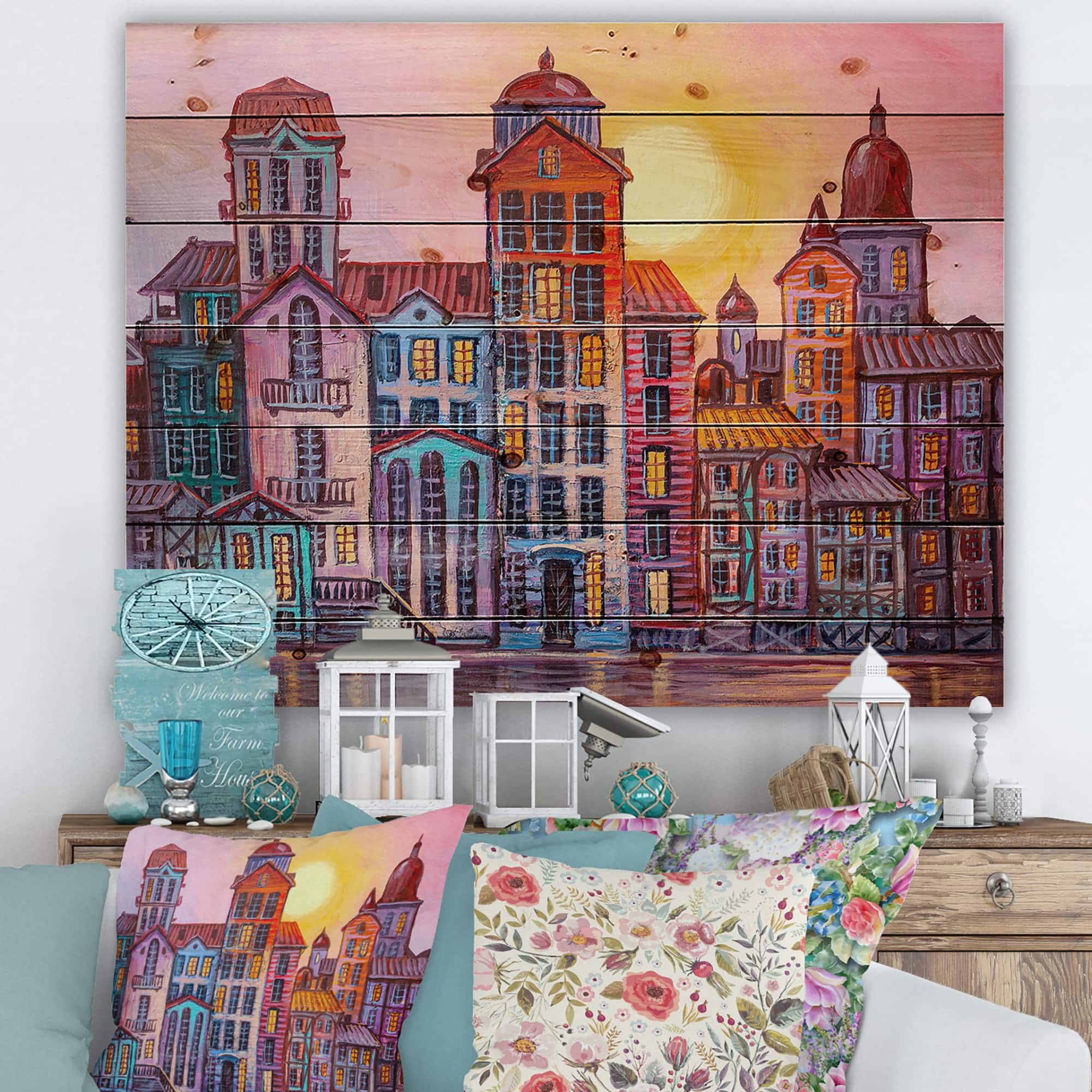 Designart - Street Scene In Old Town With Colorful Buildings - Mid-Century Modern Print on Natural Pine Wood