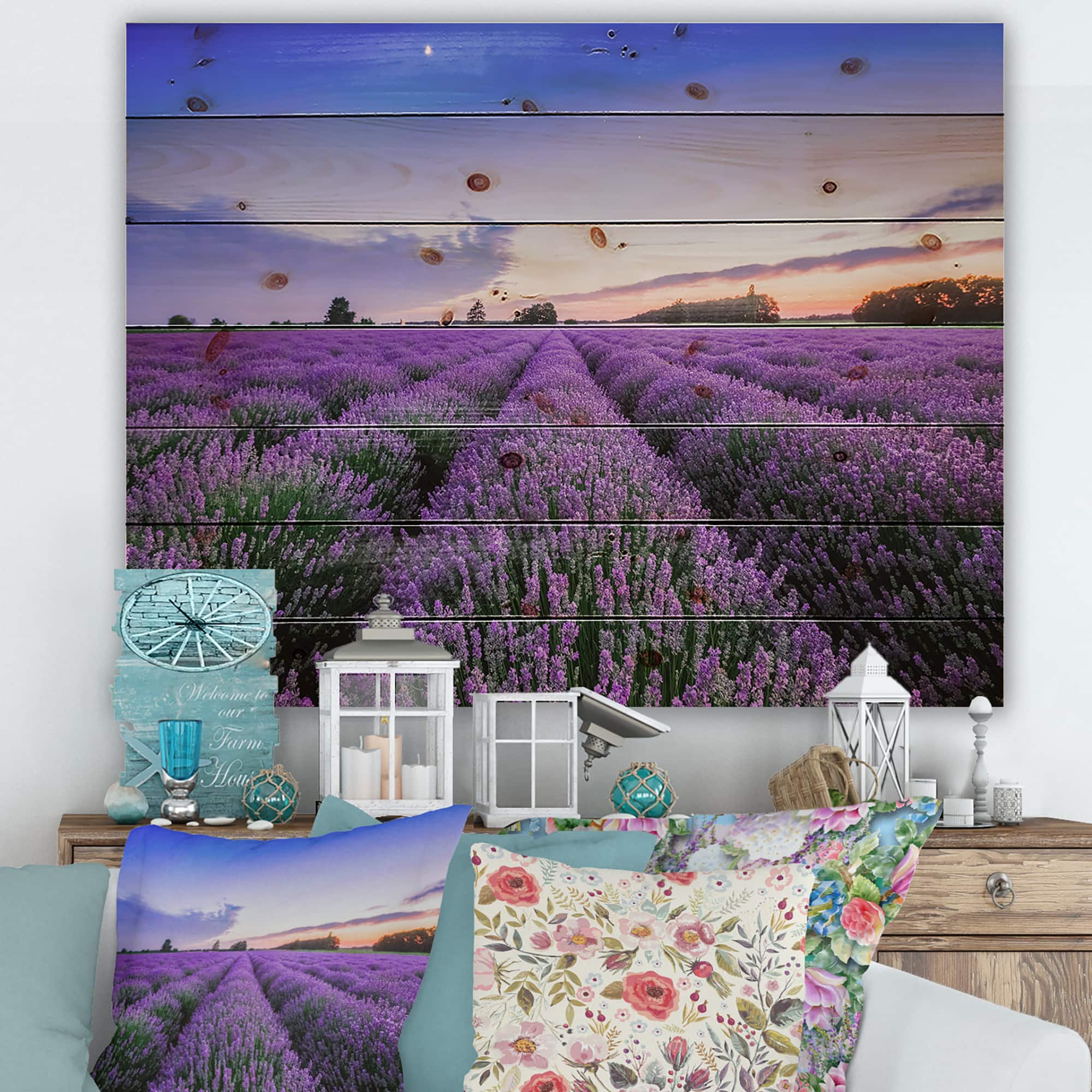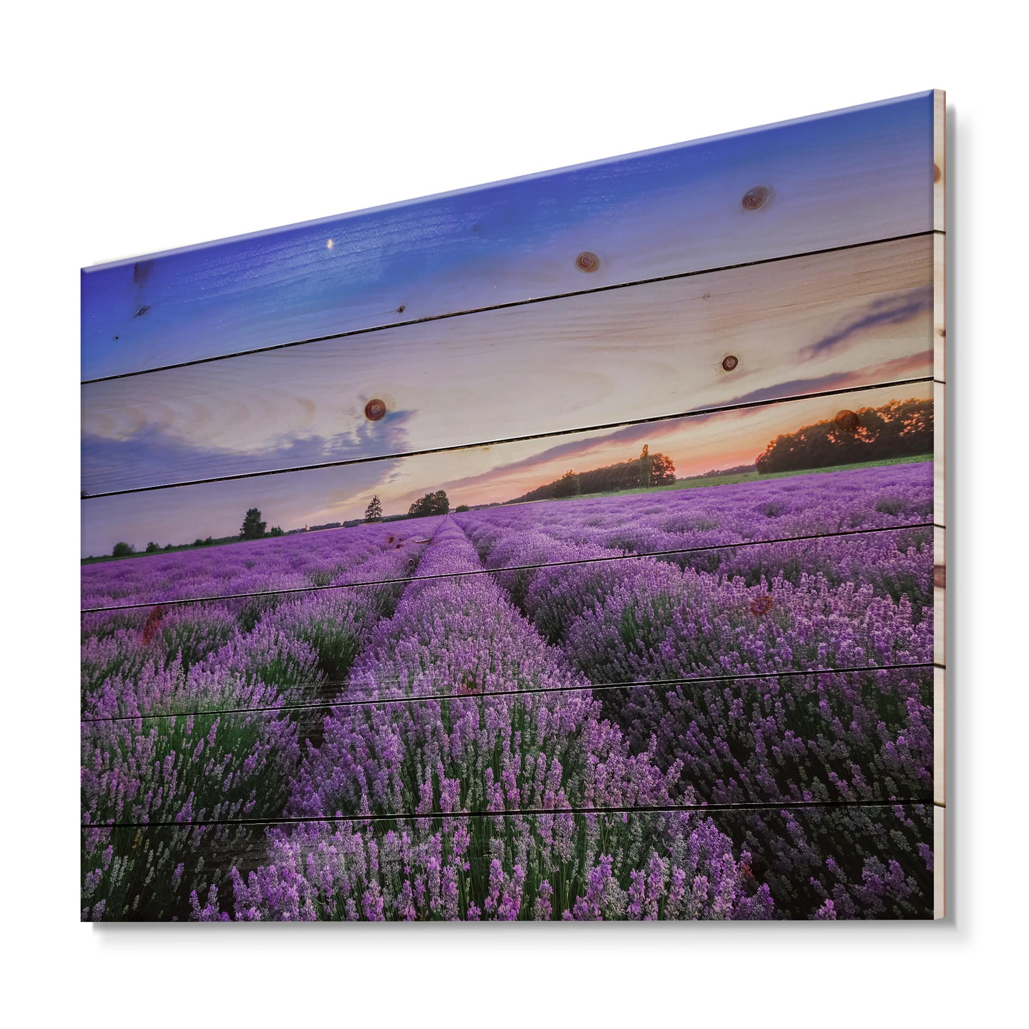 Designart - Sunrise & Dramatic Clouds Over Lavender Field II - Farmhouse Print on Natural Pine Wood
