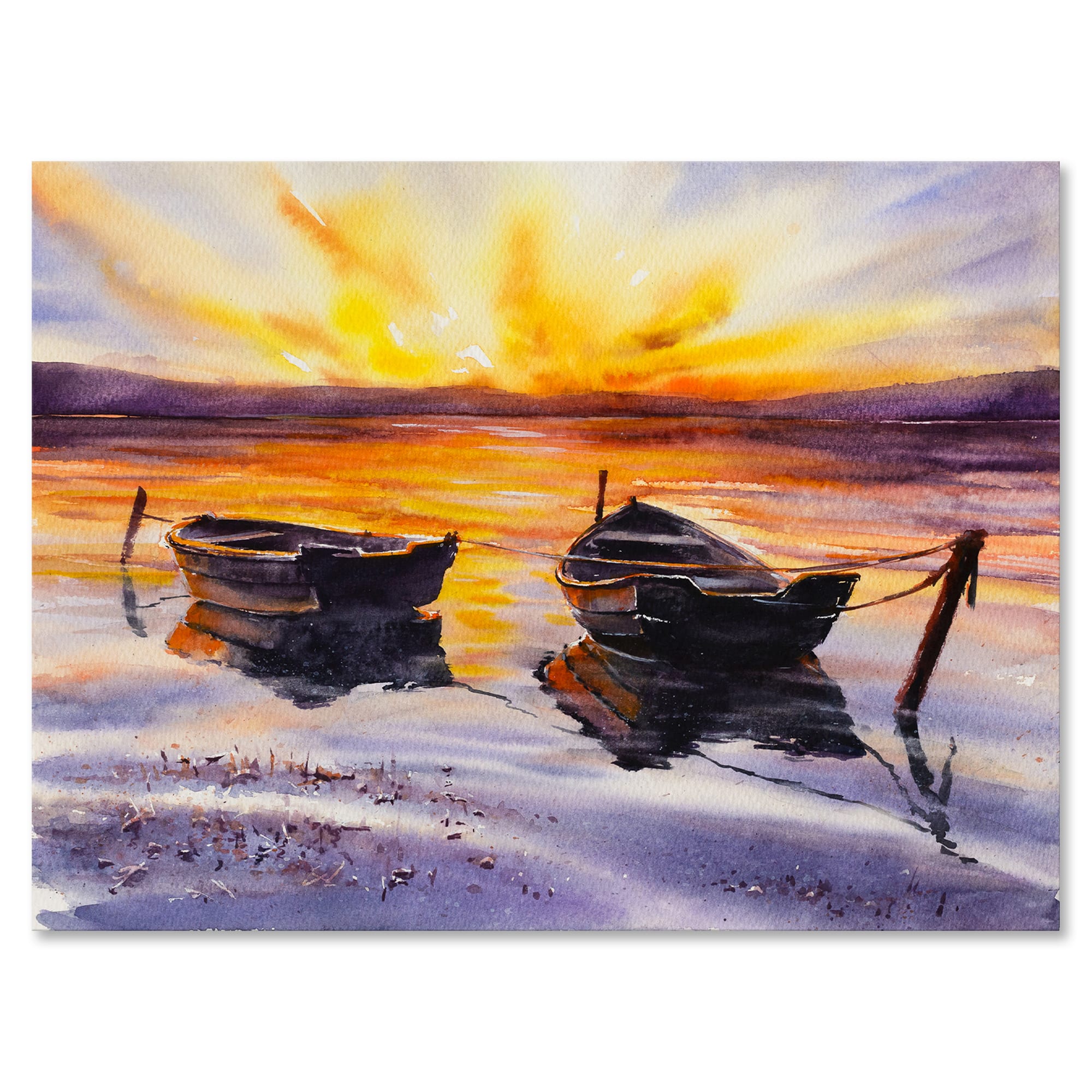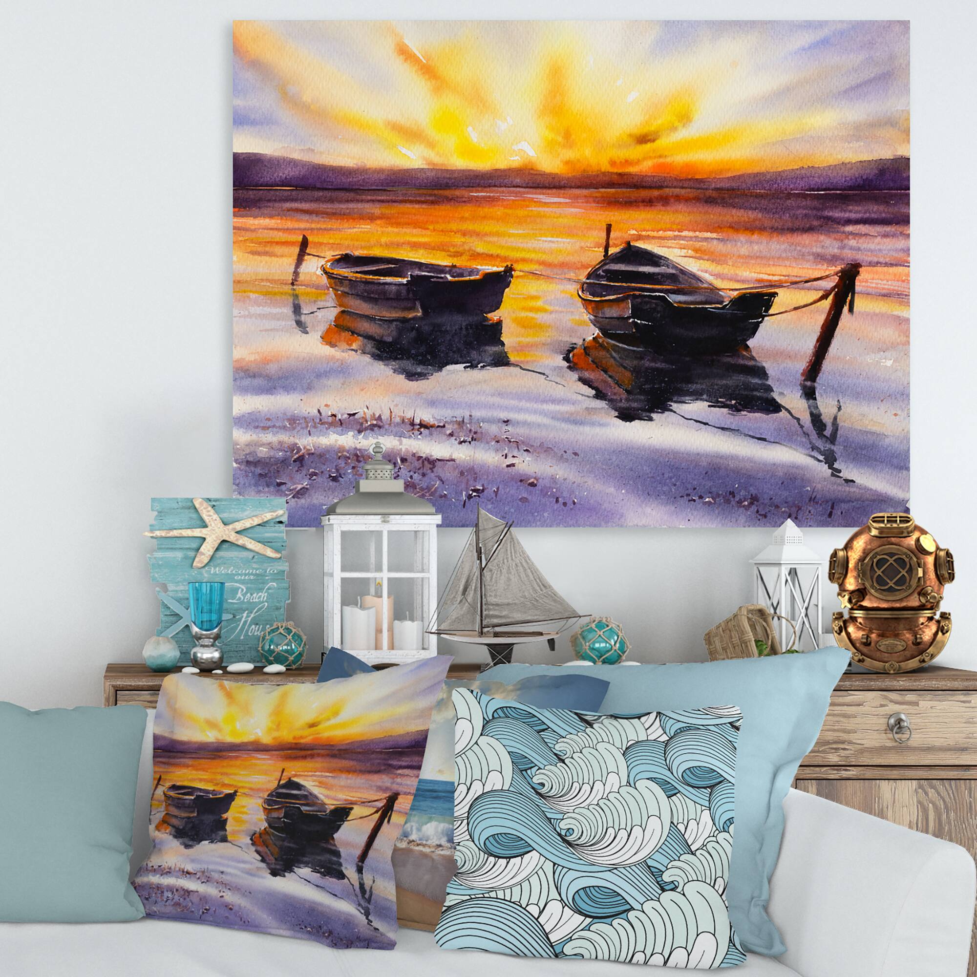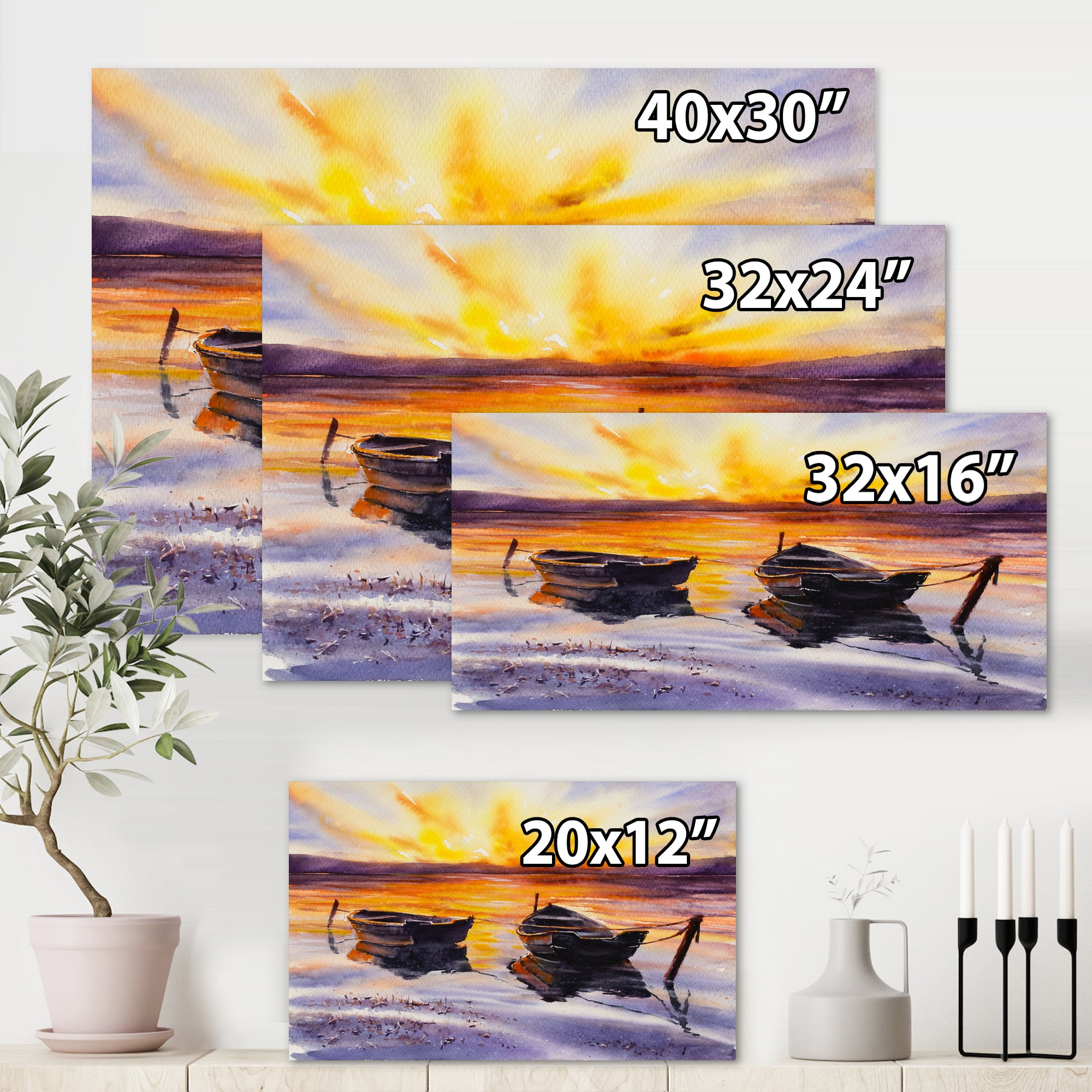 Designart - Sunset and Two Small Boats Parking On The Shore - Lake House Canvas Wall Art Print
