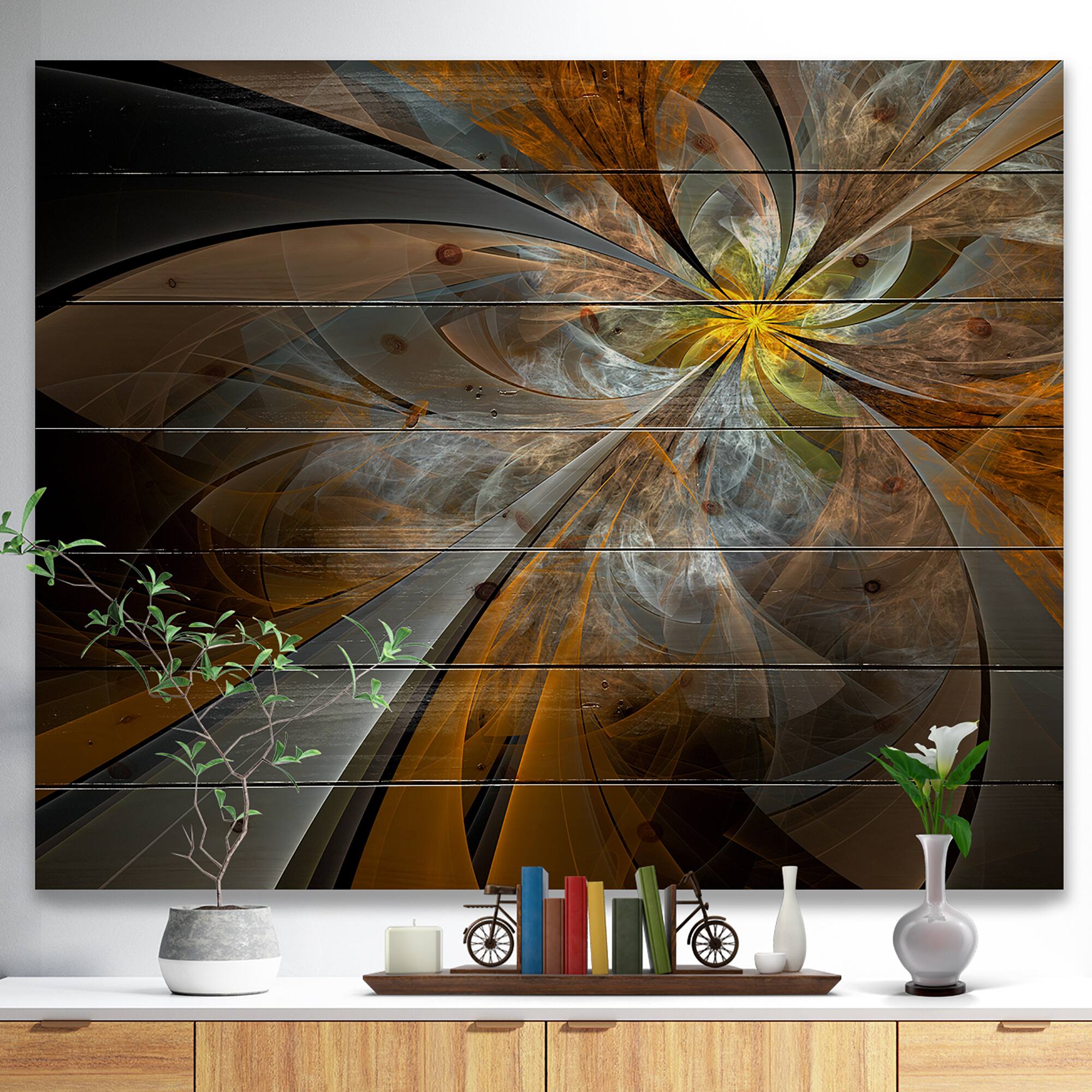 Designart - Symmetrical Yellow Fractal Flower - Abstract Print on Natural Pine Wood