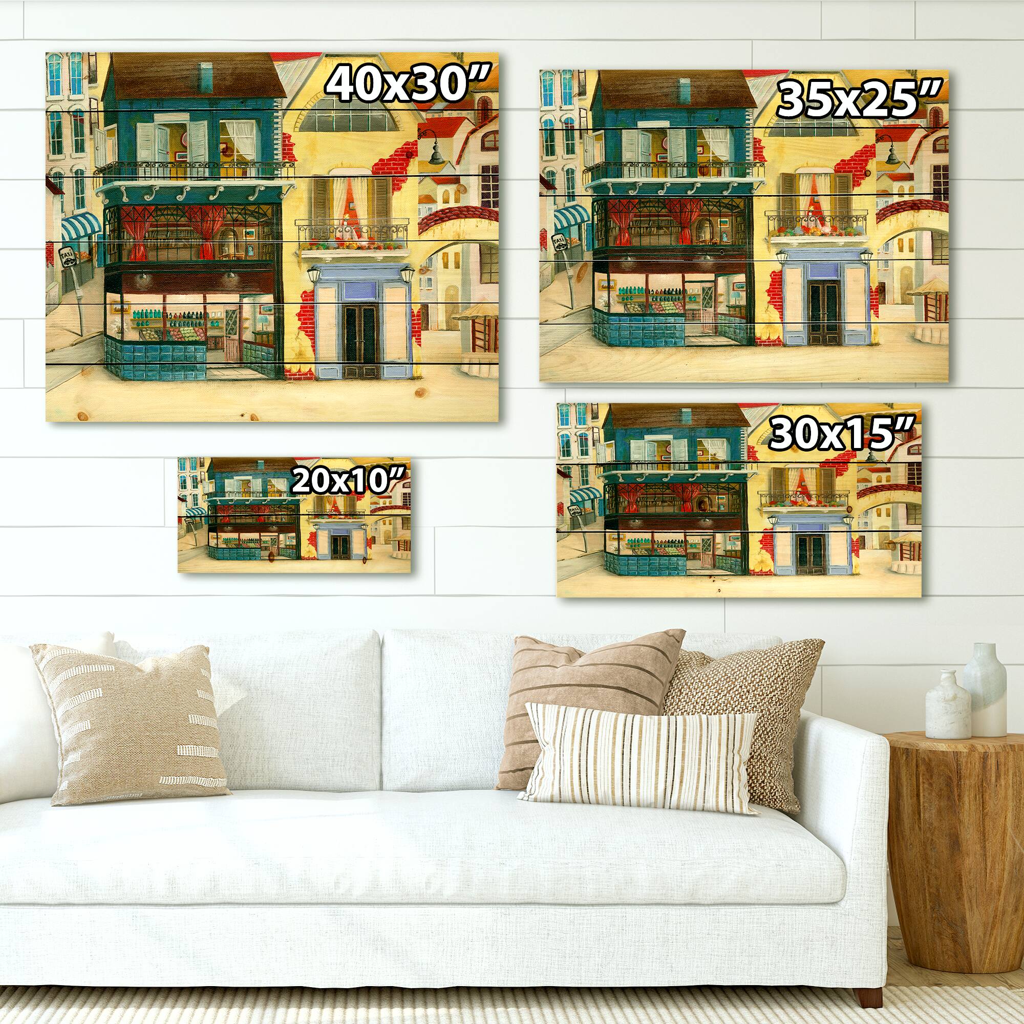 Designart - The Facade of The Buildings In A Cozy Streets - French Country Print on Natural Pine Wood