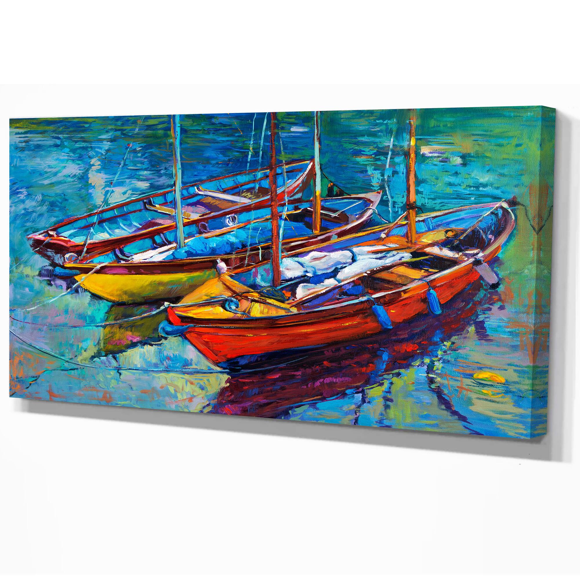 Designart - Three Fishing Boat Oil Painting - Sea & Shore Painting Print on Wrapped Canvas