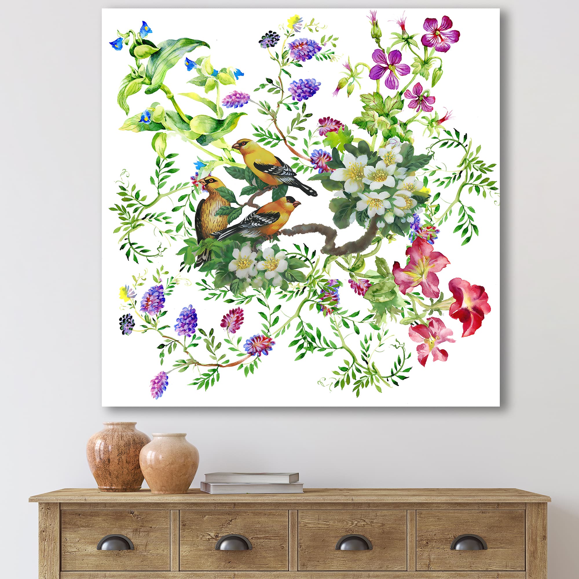 Designart - Tropical Birds With On Blooming Tree - Traditional Canvas Wall Art Print