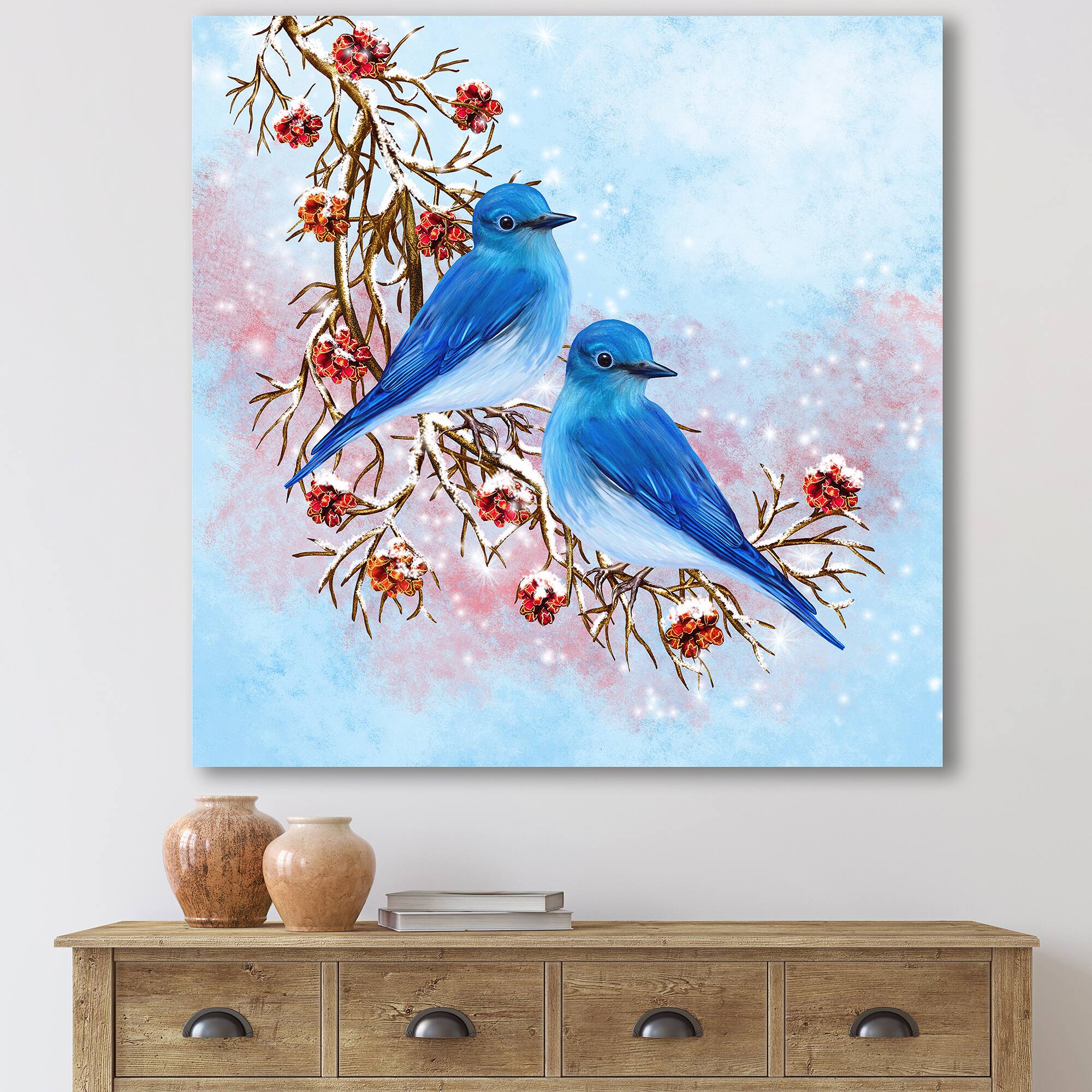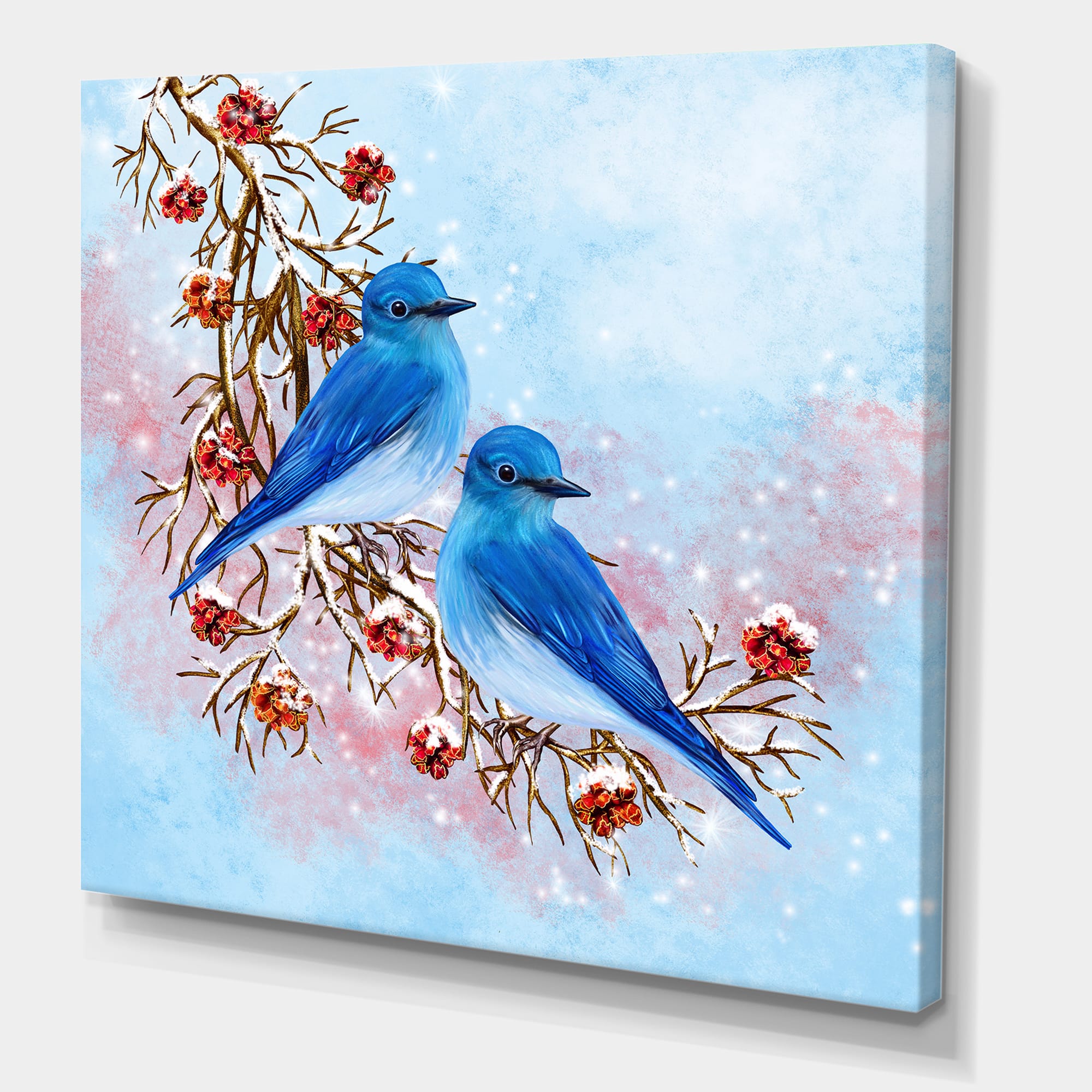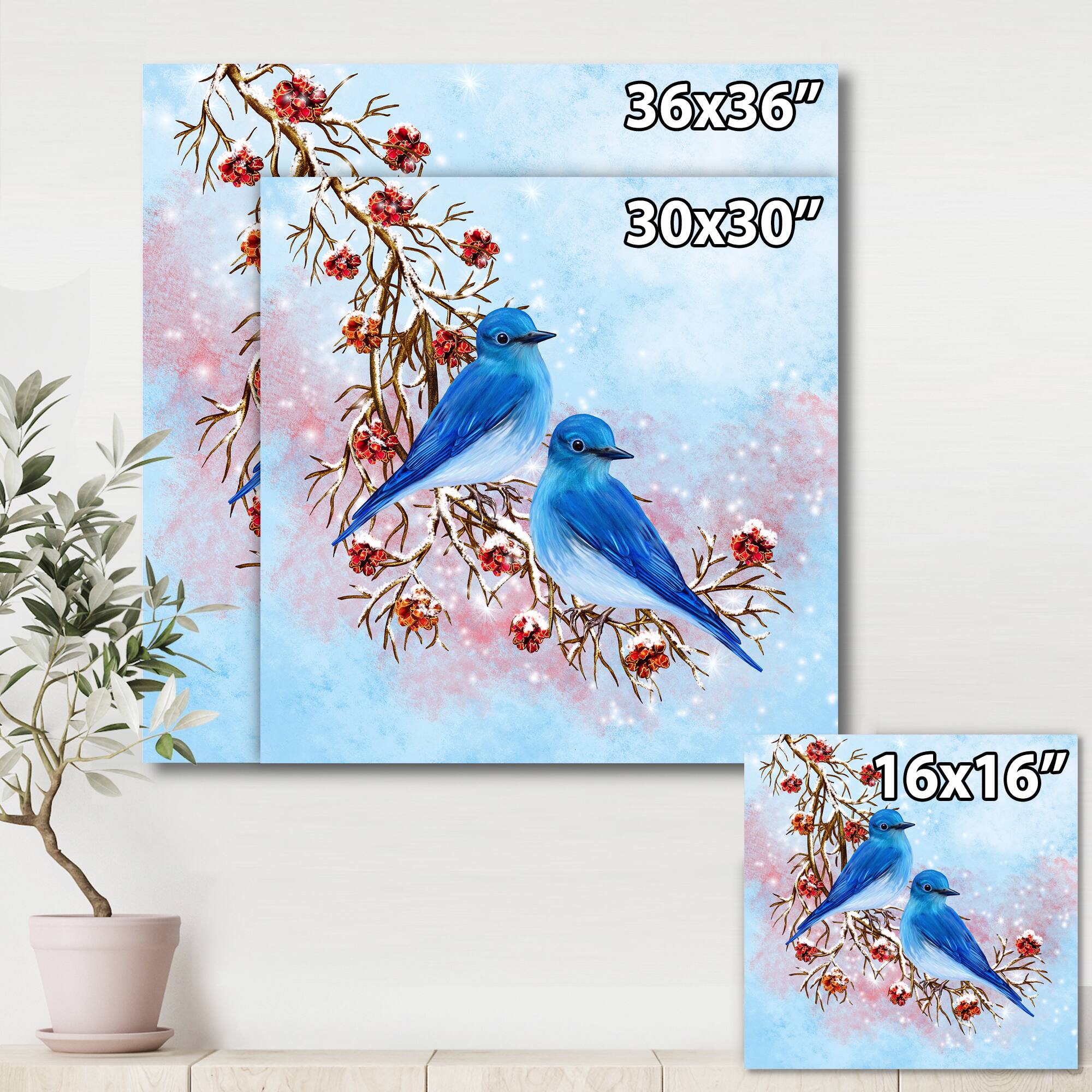 Designart - Two Blue Birds Sitting On A Branch With Berries - Traditional Canvas Wall Art Print