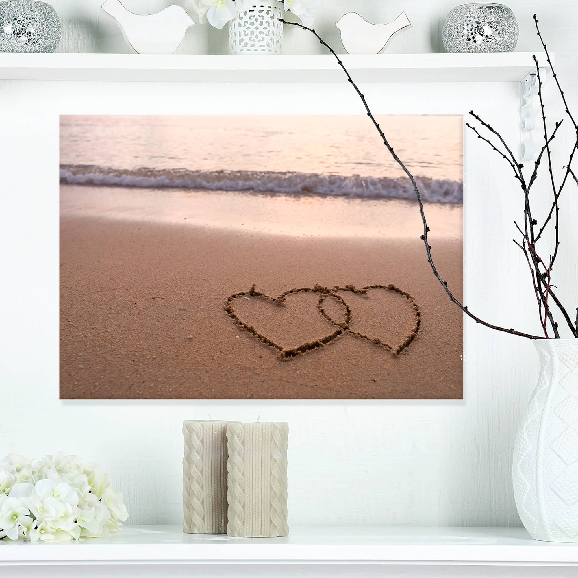 Designart - Two Hearts Drawn on the Beach - Extra Large Seascape Art Canvas