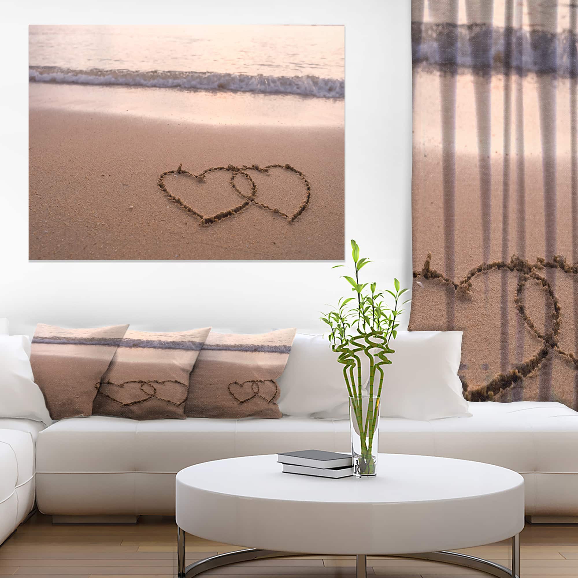 Designart - Two Hearts Drawn on the Beach - Extra Large Seascape Art Canvas