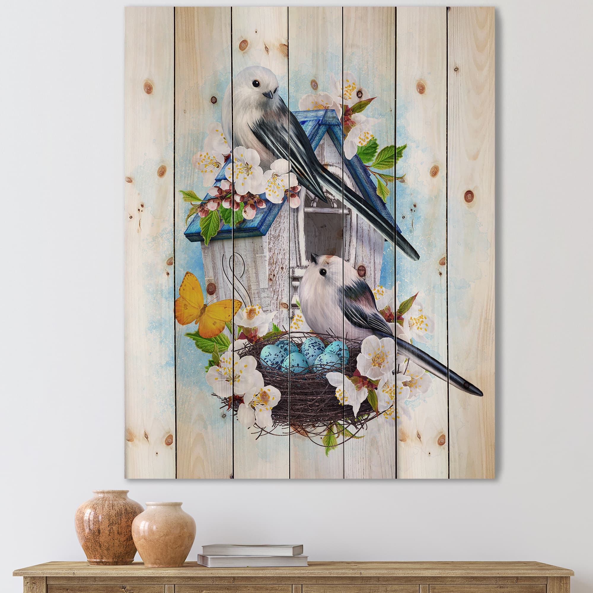 Designart - Two Tit Birds Sitting Near The Nest With Eggs II - Traditional Print on Natural Pine Wood