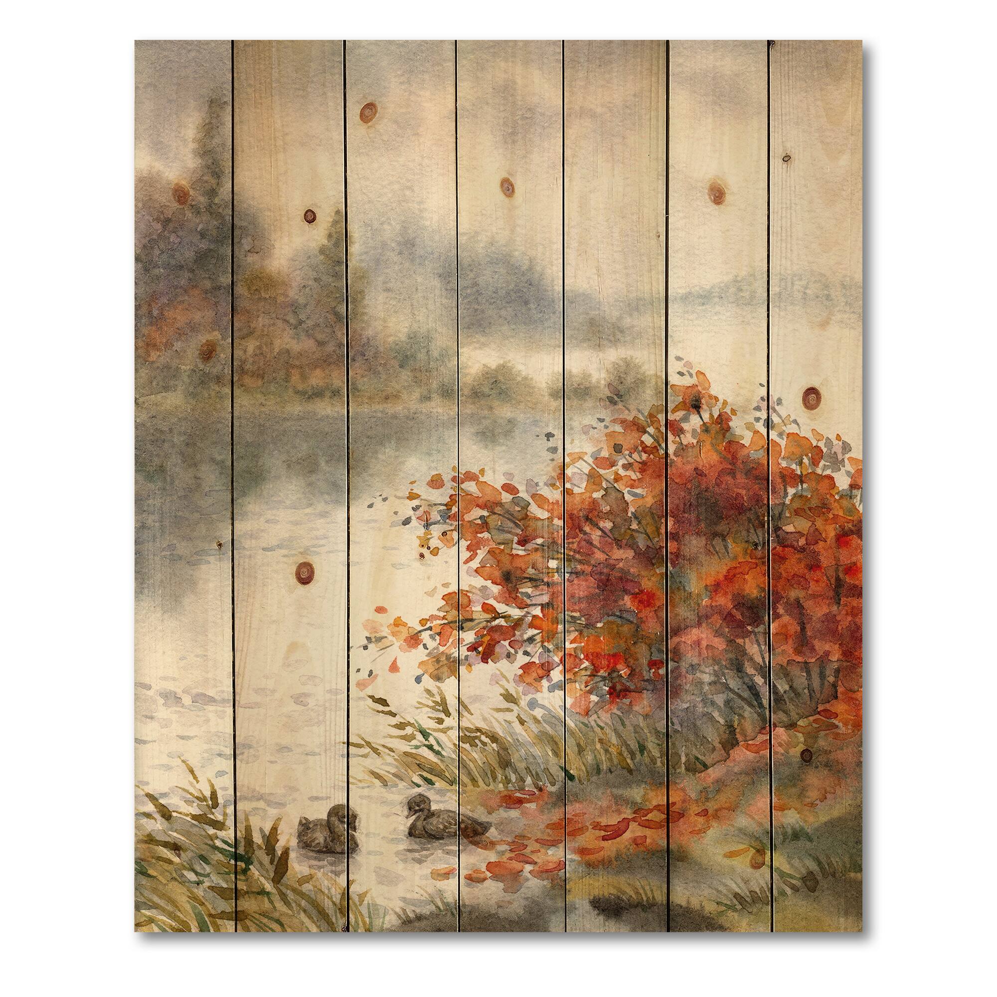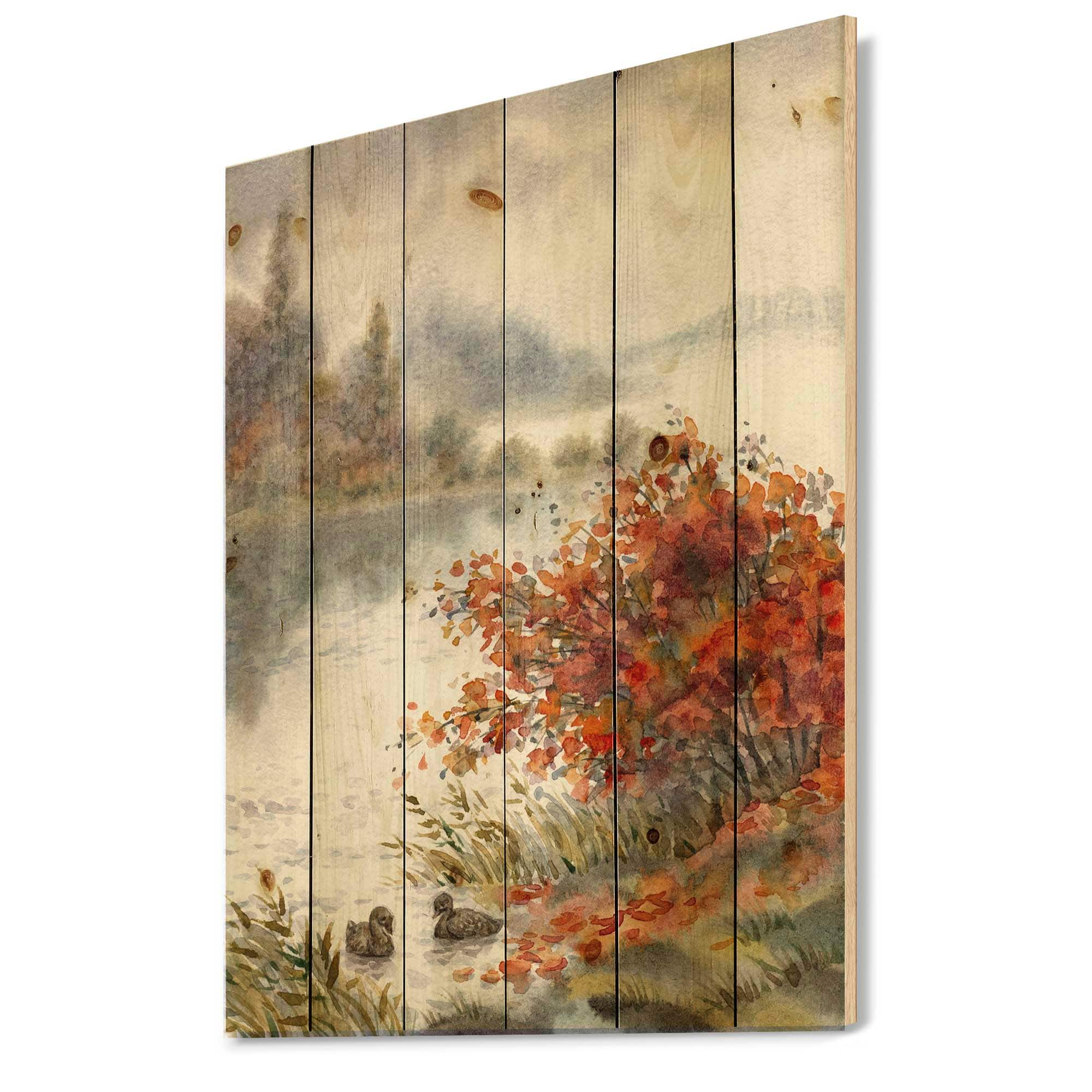 Designart - View Of The Lake In Autumn - Traditional Print on Natural Pine Wood