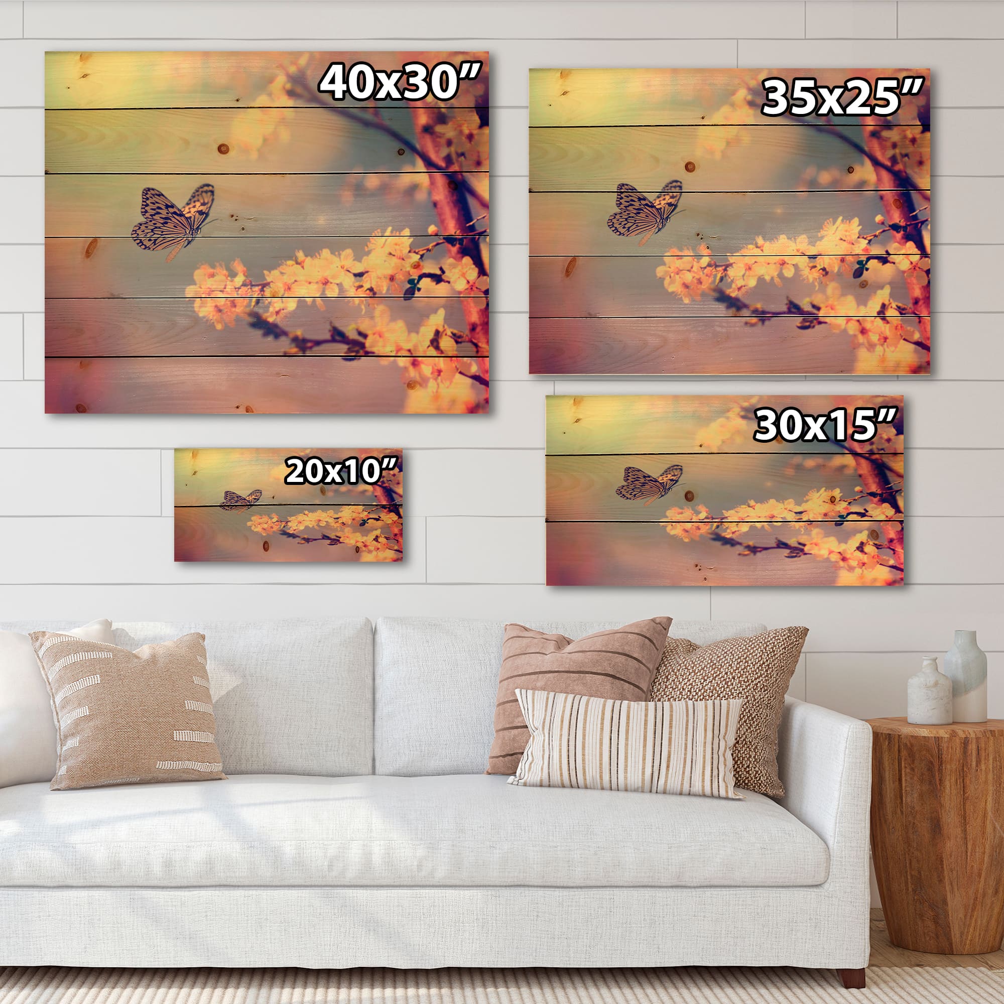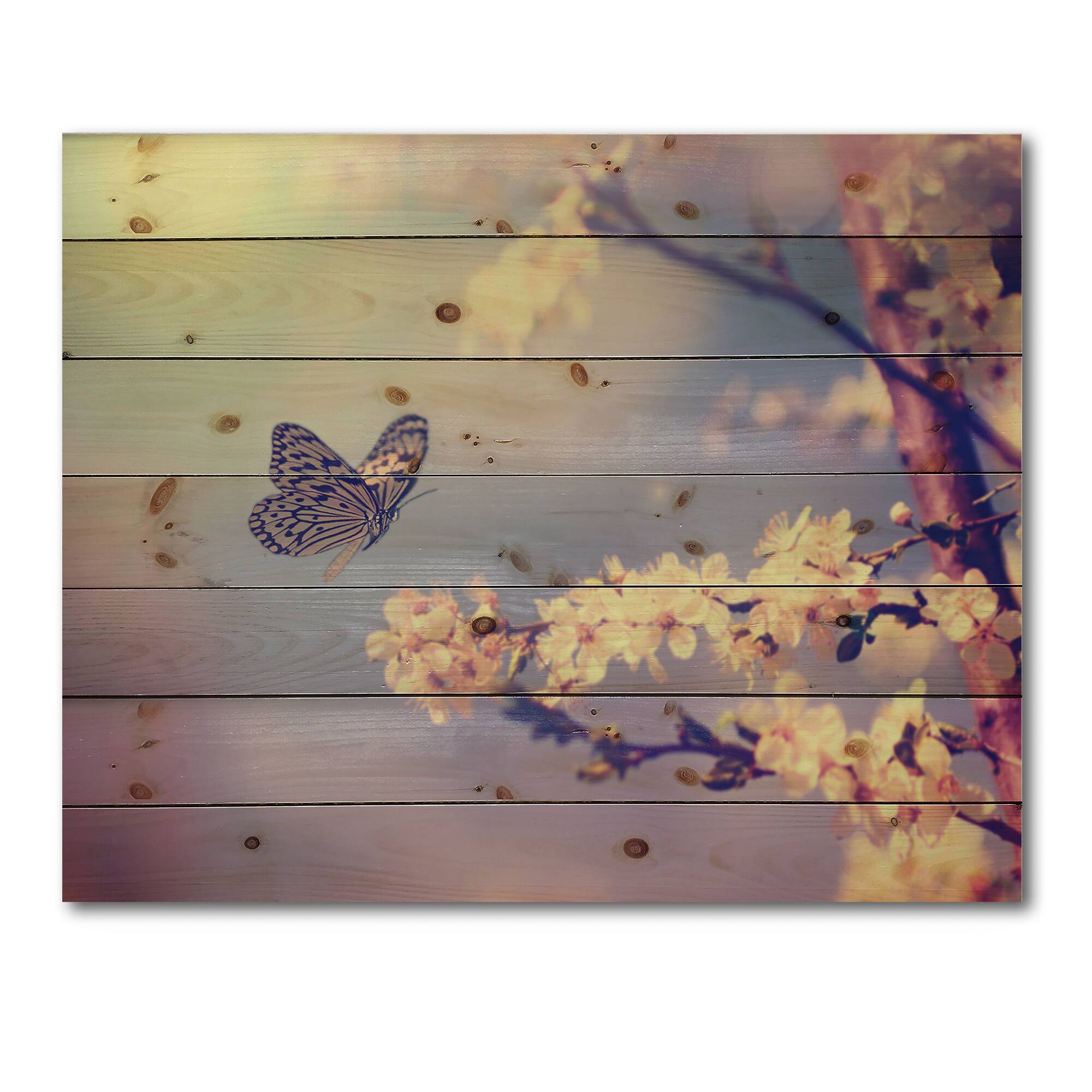 Designart - Vintage Butterfly Flying To A White Flower - Traditional Print on Natural Pine Wood