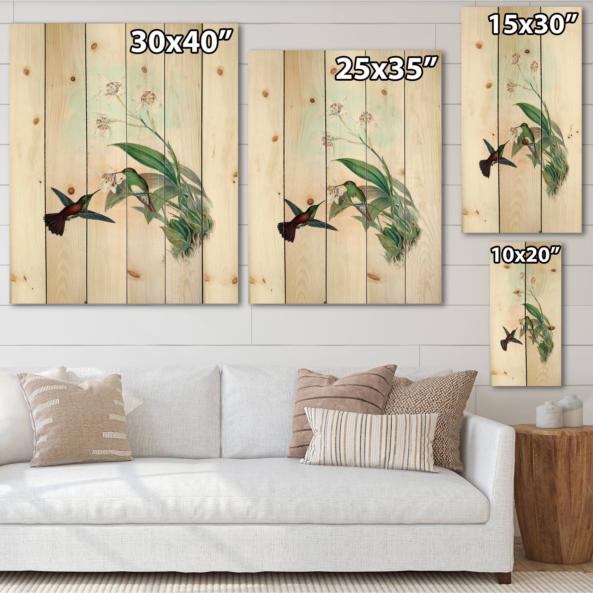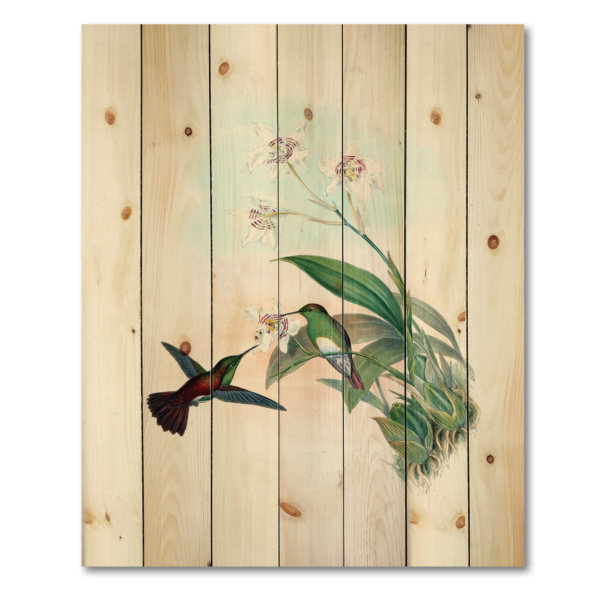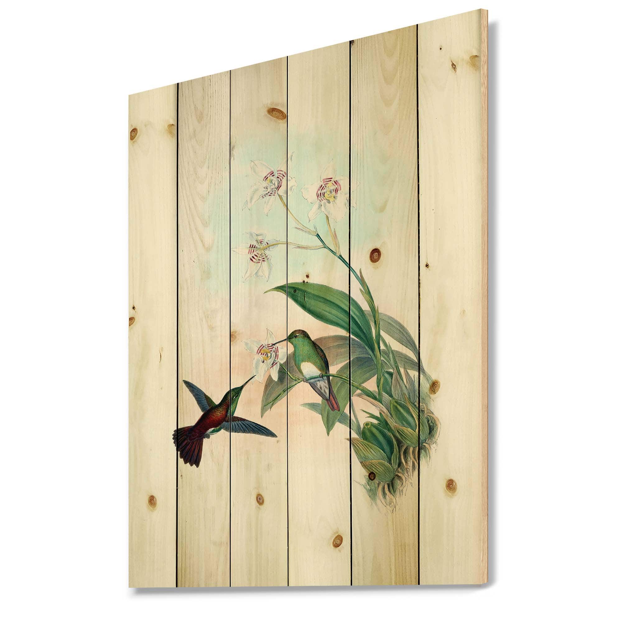 Designart - Vintage Hummingbird Flying To A Flower - Traditional Print on Natural Pine Wood
