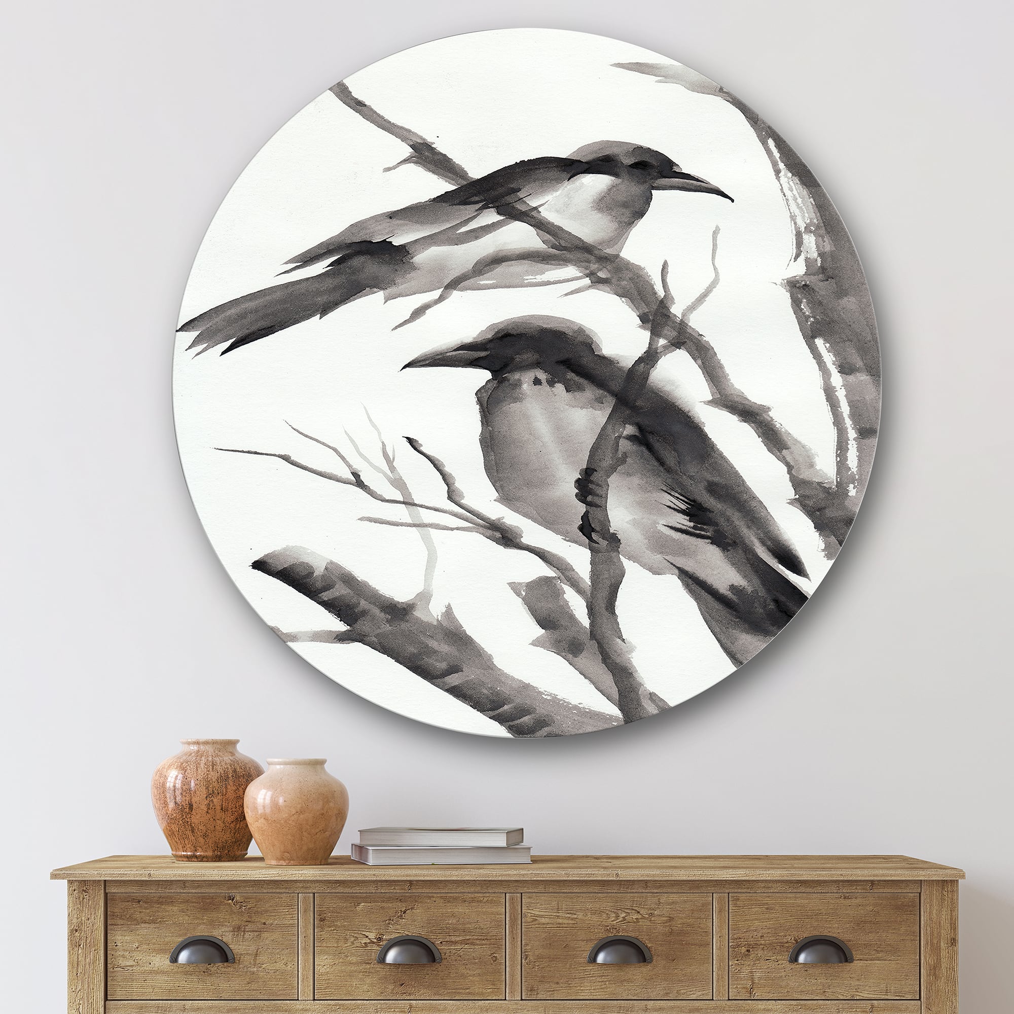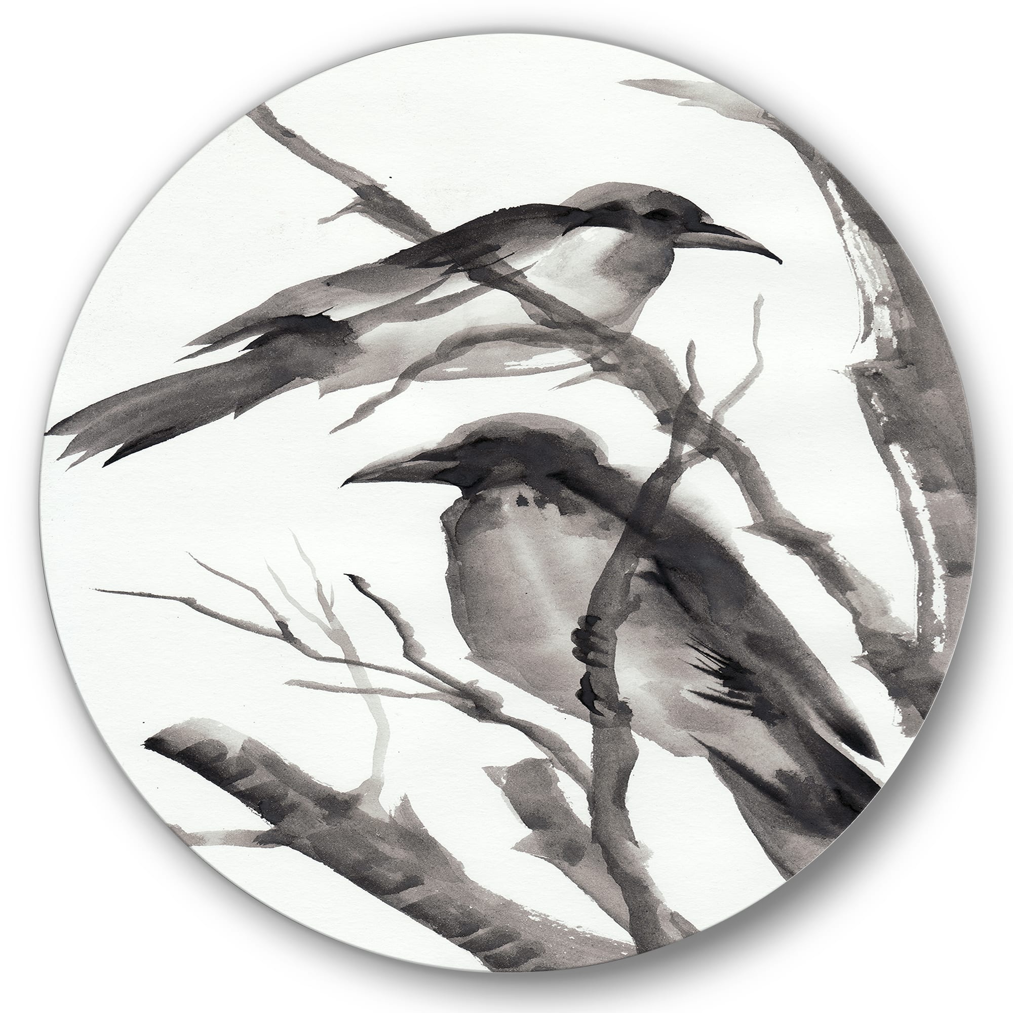 Designart - Vintage Monochrome Sleeping Crows - Traditional Metal Circle Wall Art