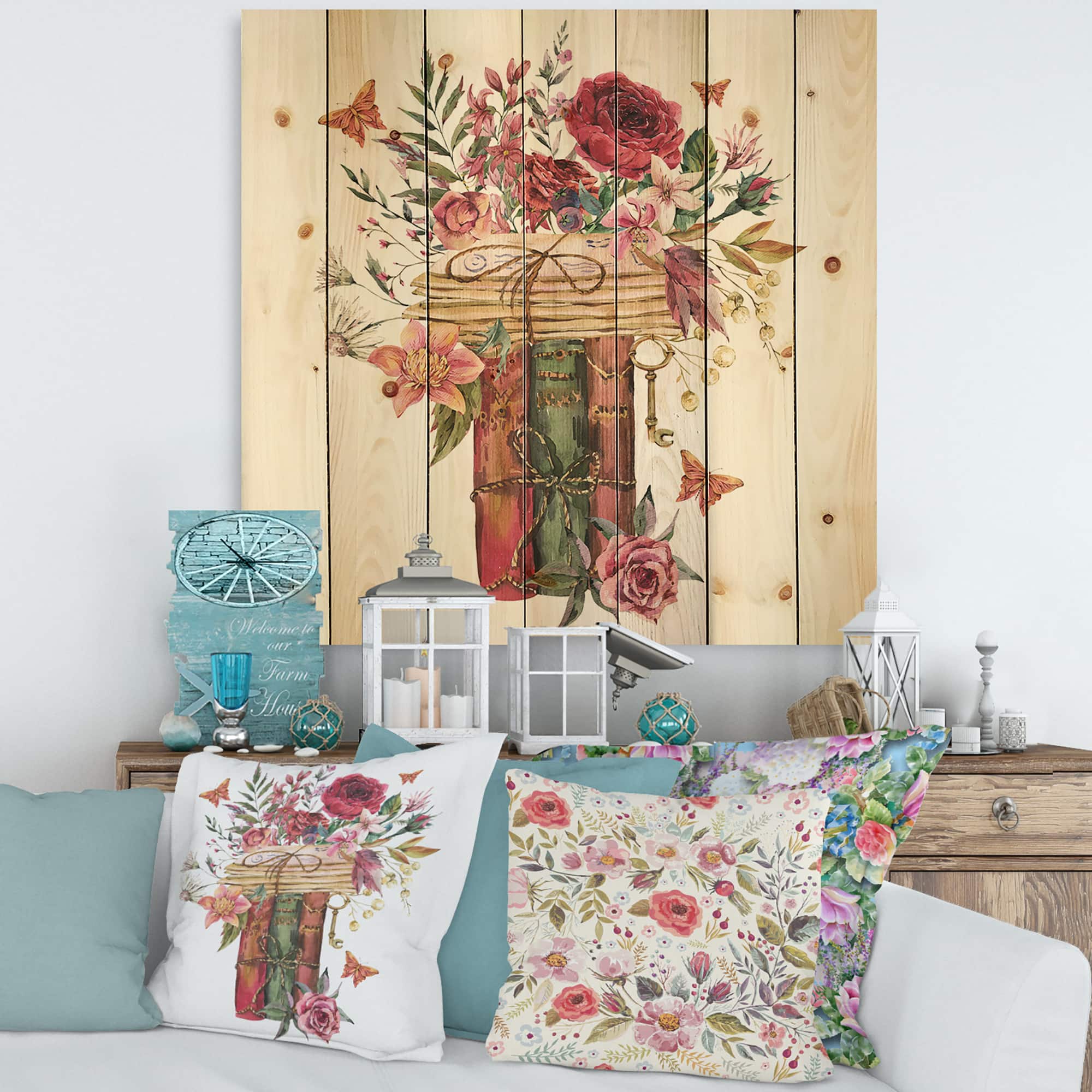 Designart - Vintage Old Books With Wildflowers - Farmhouse Print on Natural Pine Wood