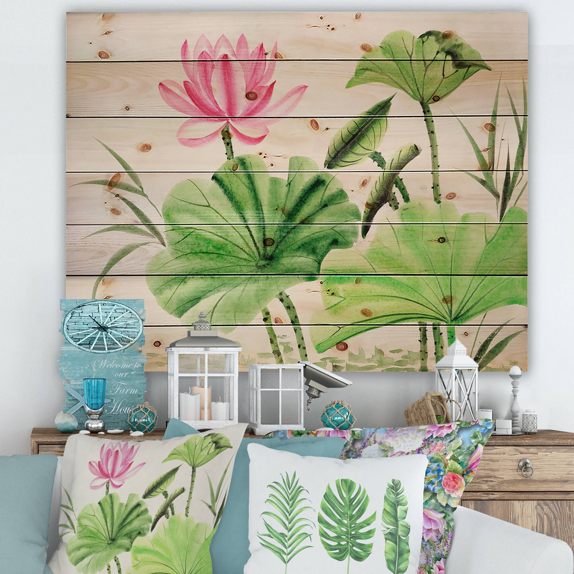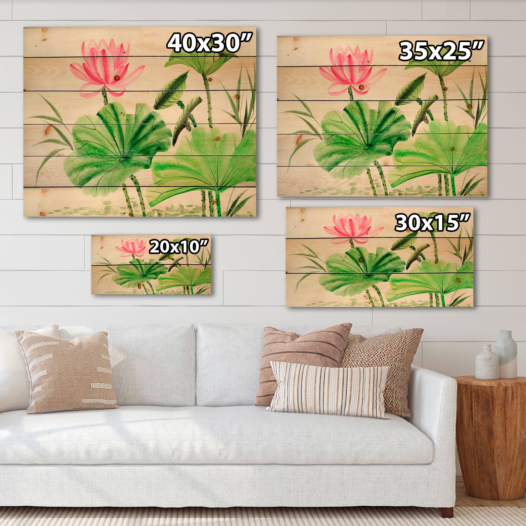 Designart - Vintage Pink Lotuses In The Pond V - Traditional Print on Natural Pine Wood