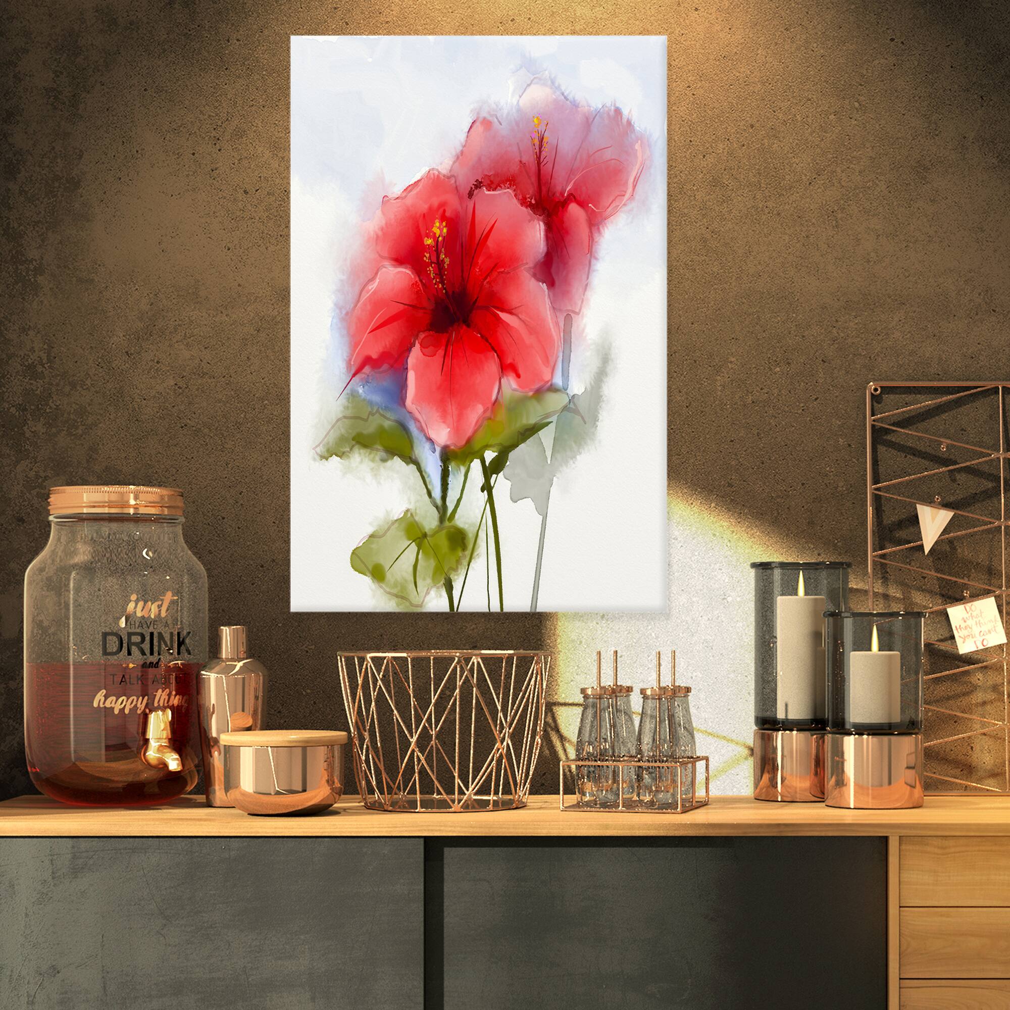 Designart - Watercolor Painting Red Hibiscus Flower - Large Floral Canvas Art Print