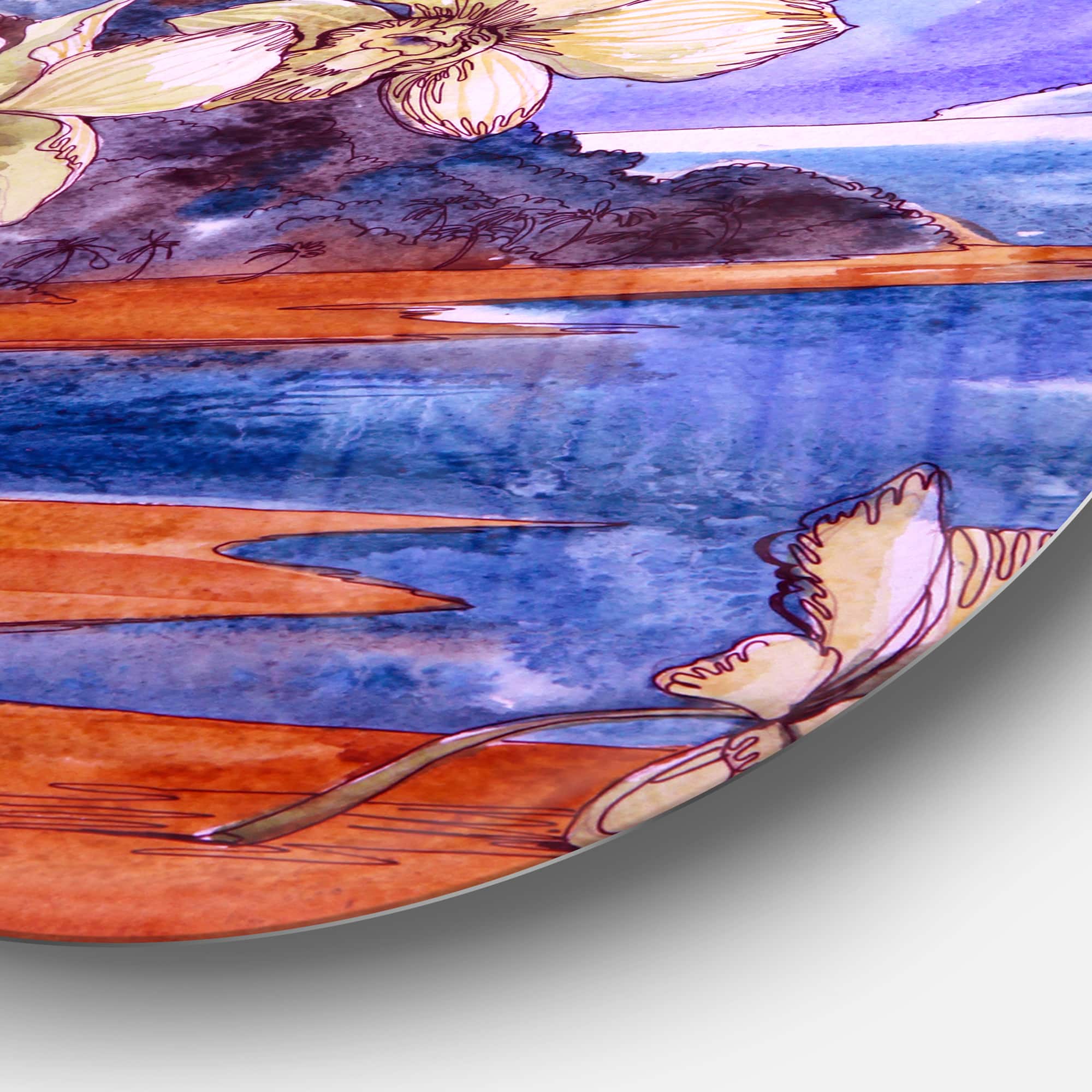 Designart - White Orchid with Sea' Floral Circle Metal Wall Art