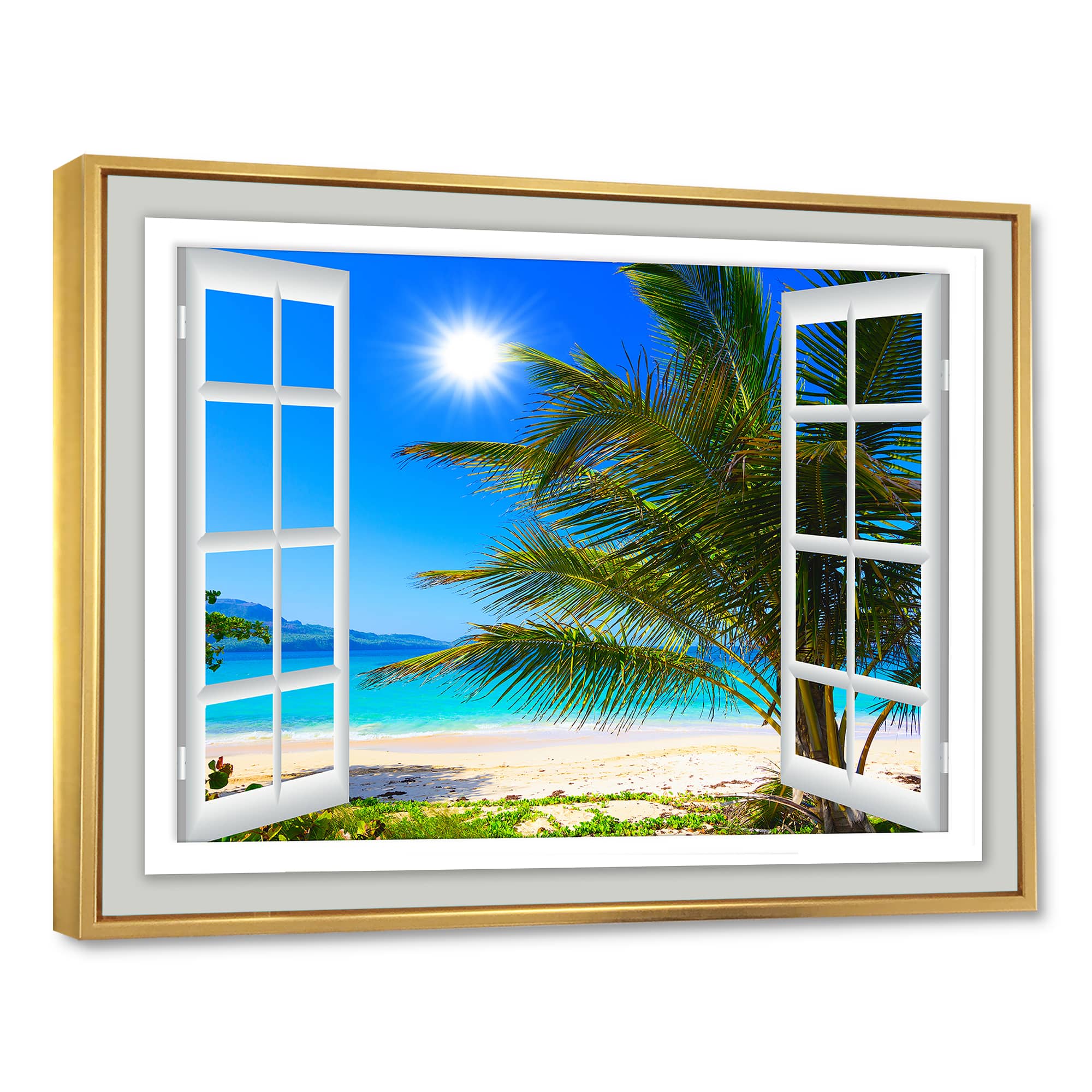 Designart - Window Open to Beach with Palm - Extra Large Seashore Framed Canvas Art