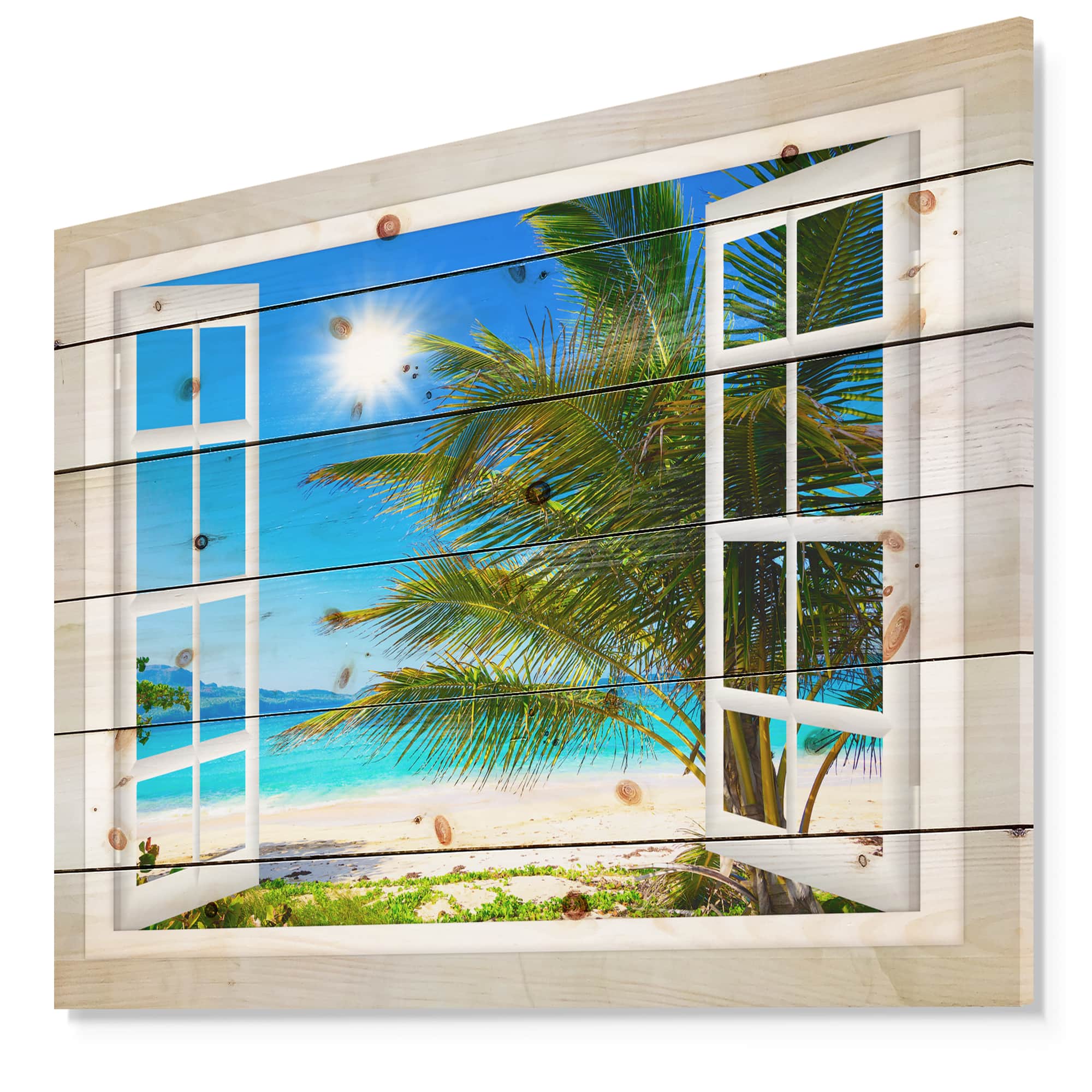 Designart - Window Open to Beach with Palm - Seashore Print on Natural Pine Wood