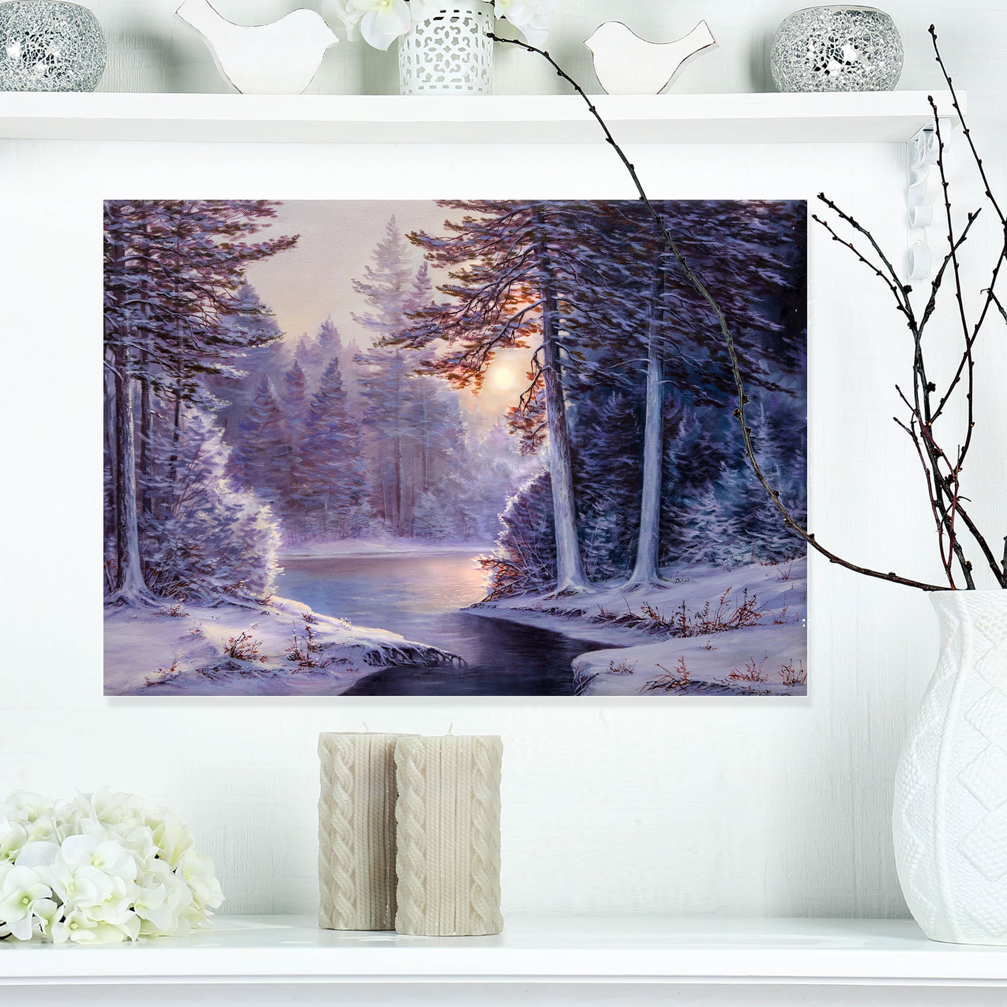 Designart - Winter Forest with the River in Frosty Day - Landscapes Painting Print on Wrapped Canvas