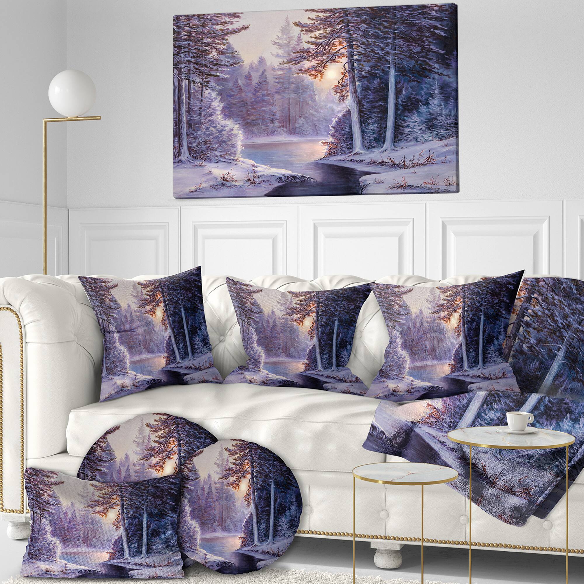 Designart - Winter Forest with the River in Frosty Day - Landscapes Painting Print on Wrapped Canvas