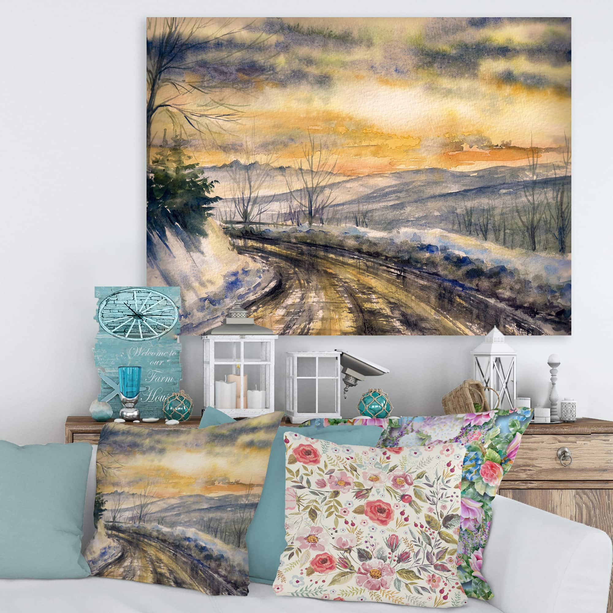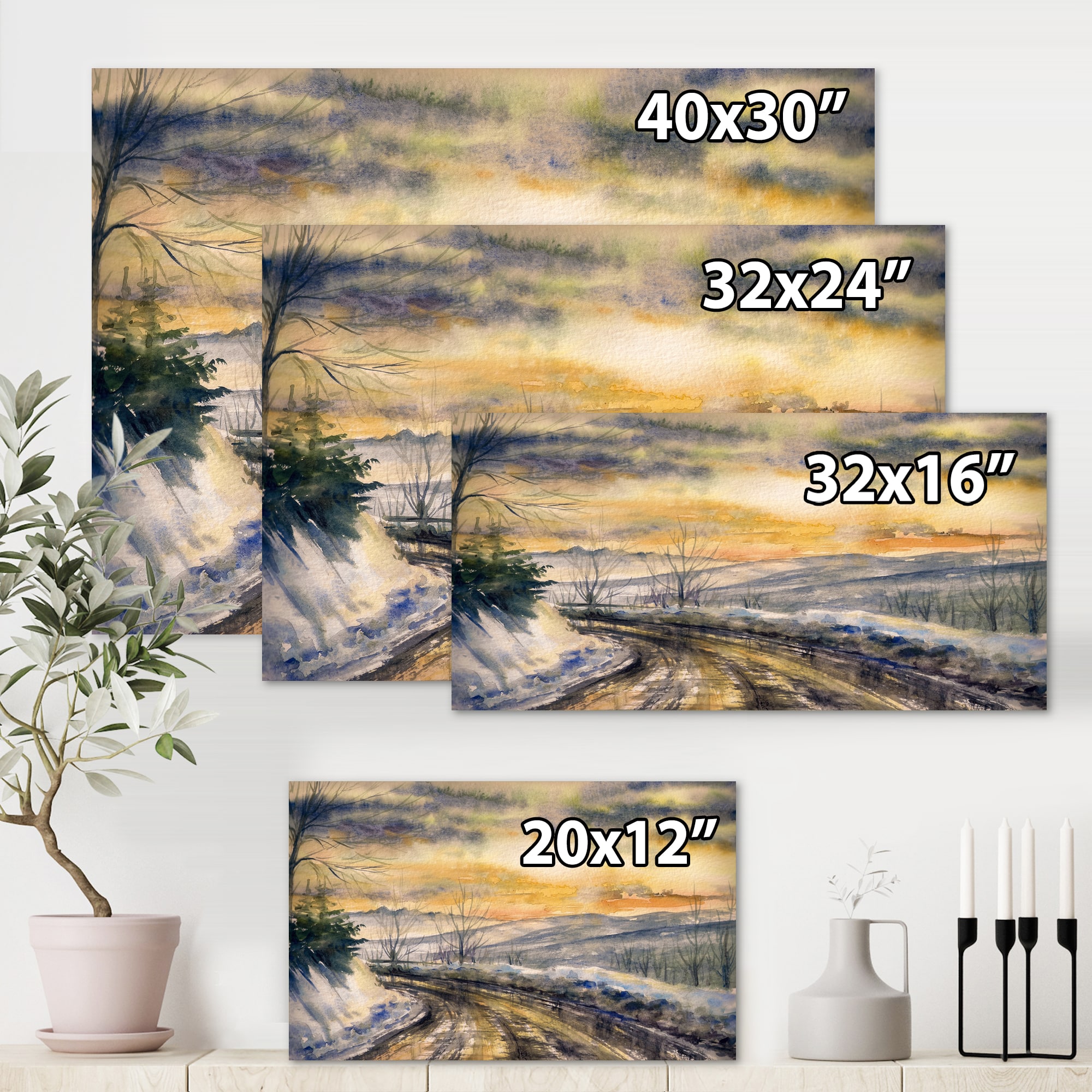 Designart - Winter Landscape With Road Under Bright Sunset - Traditional Canvas Wall Art Print