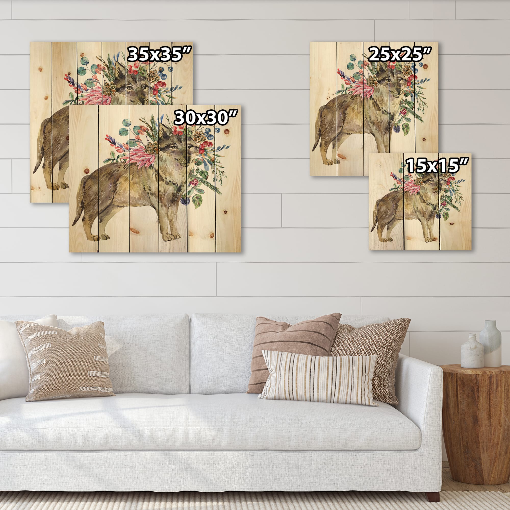 Designart - Wolf With Woodland Flowers - Farmhouse Print on Natural Pine Wood