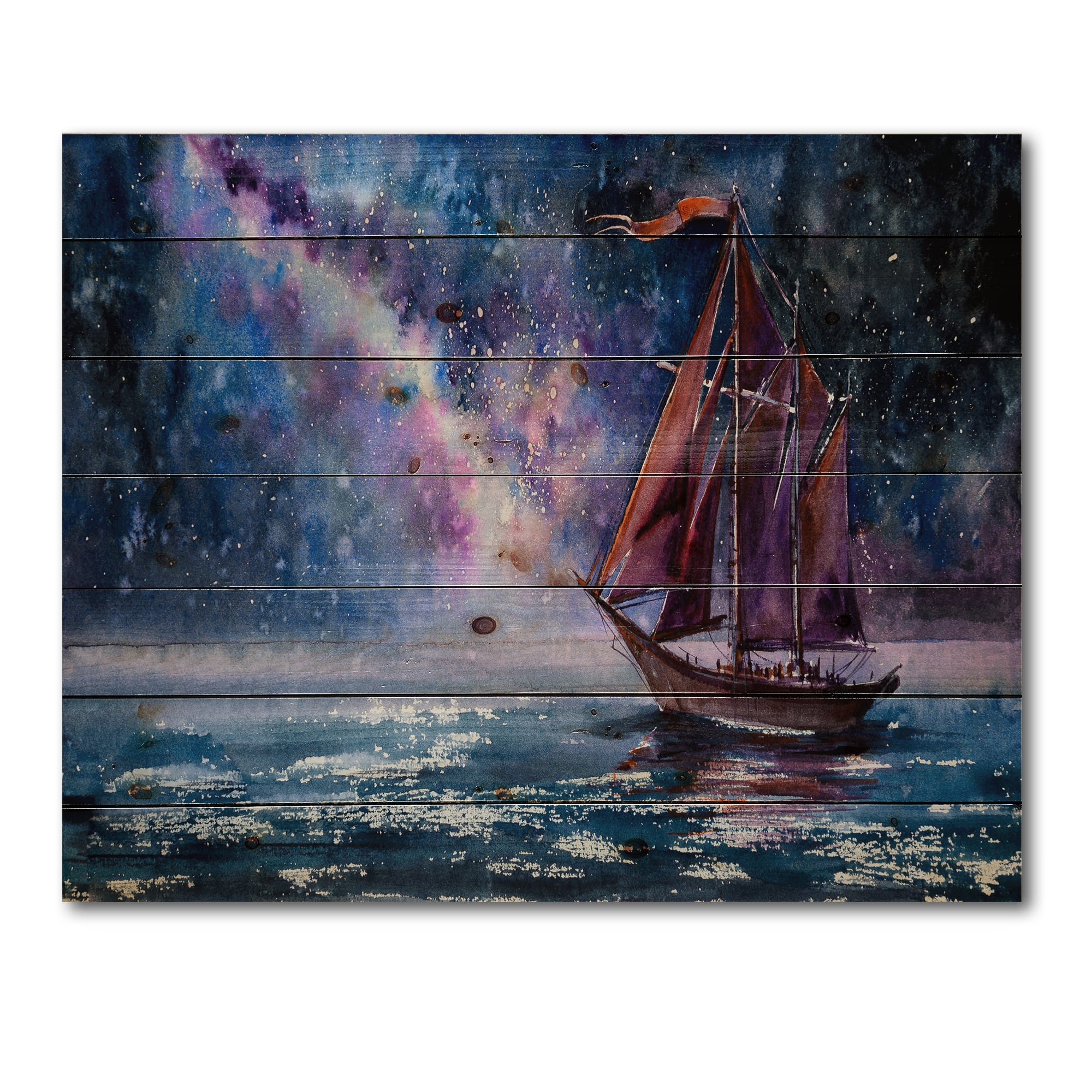 Designart - Wooden Sailboat With Red Sails & Bright Night Sky - Nautical & Coastal Print on Natural Pine Wood