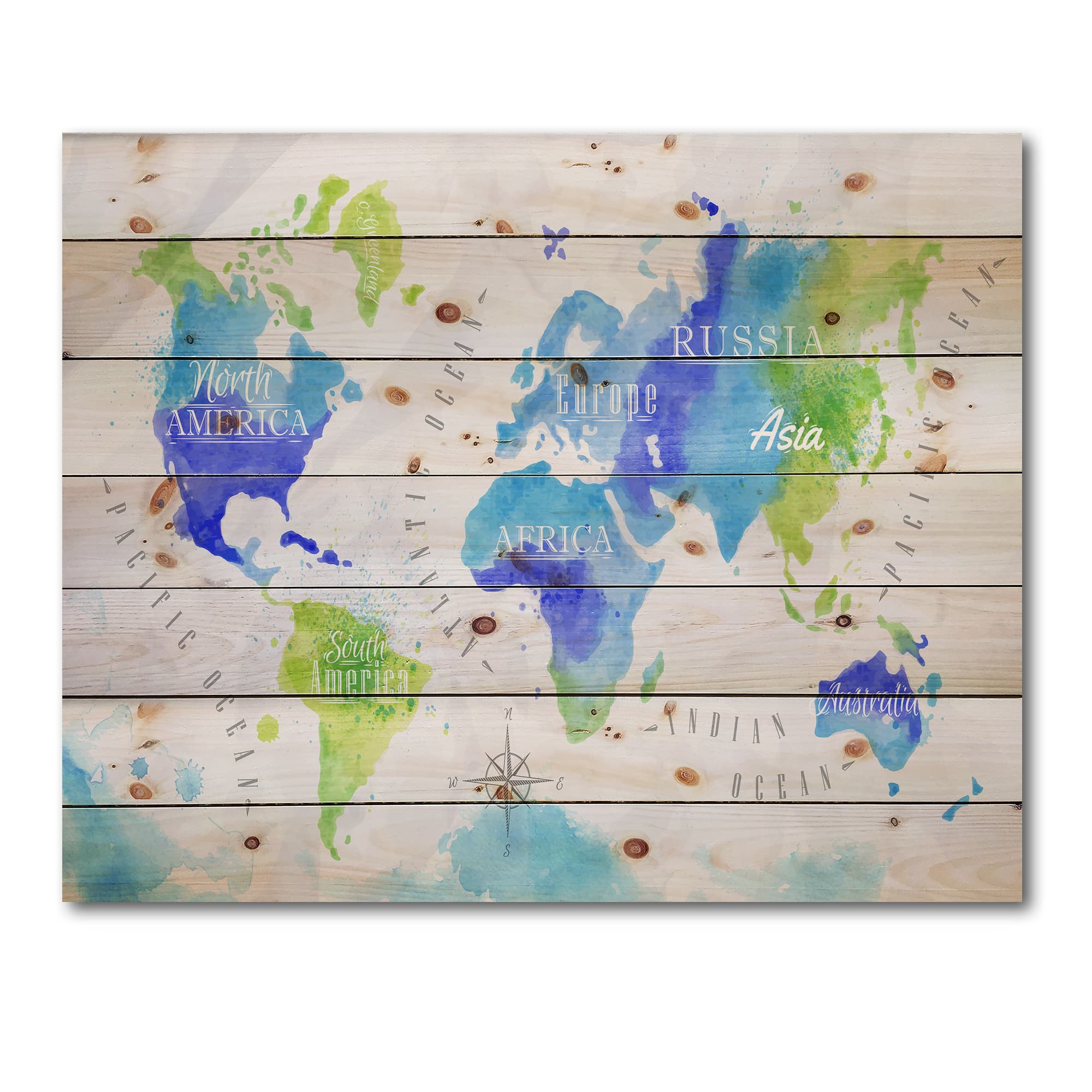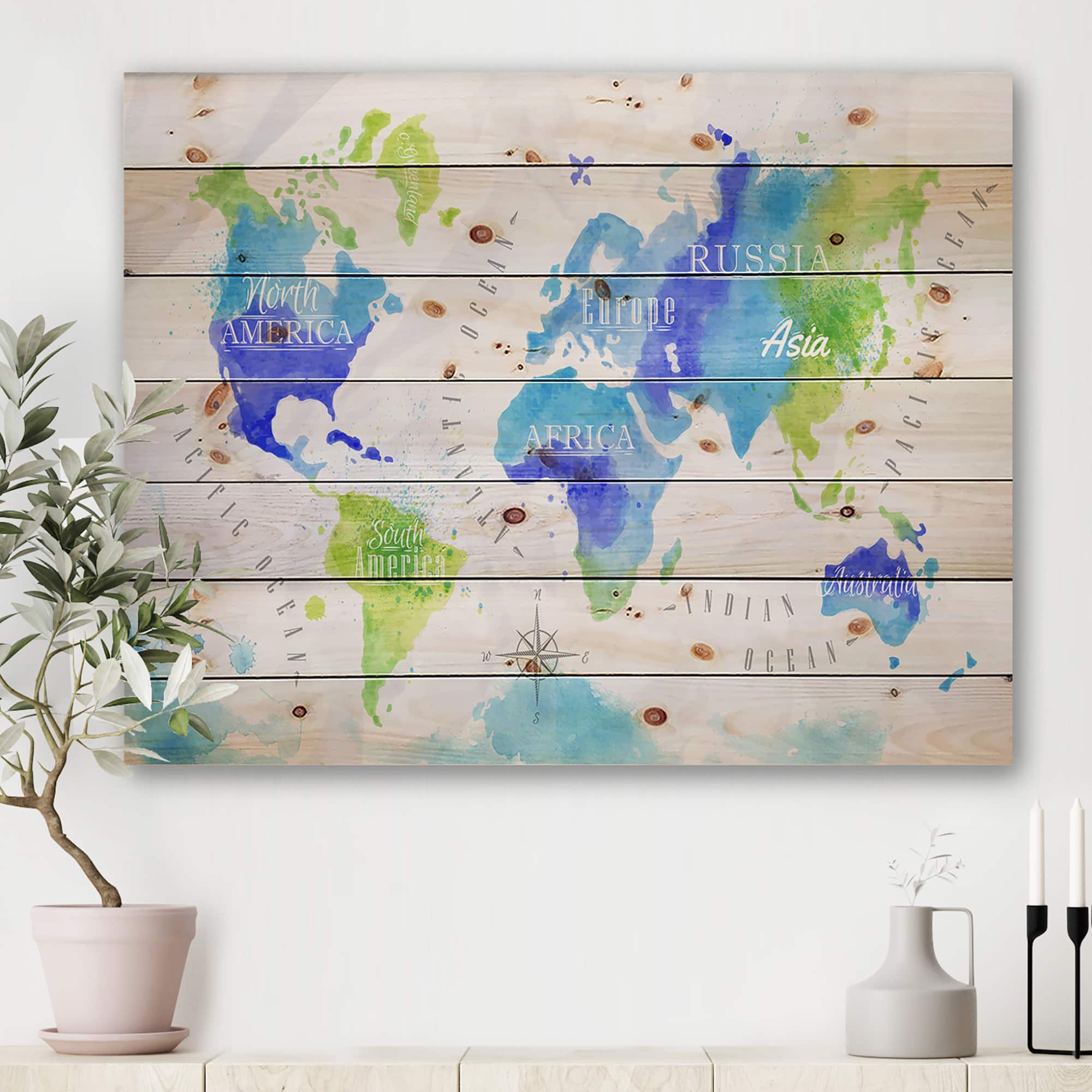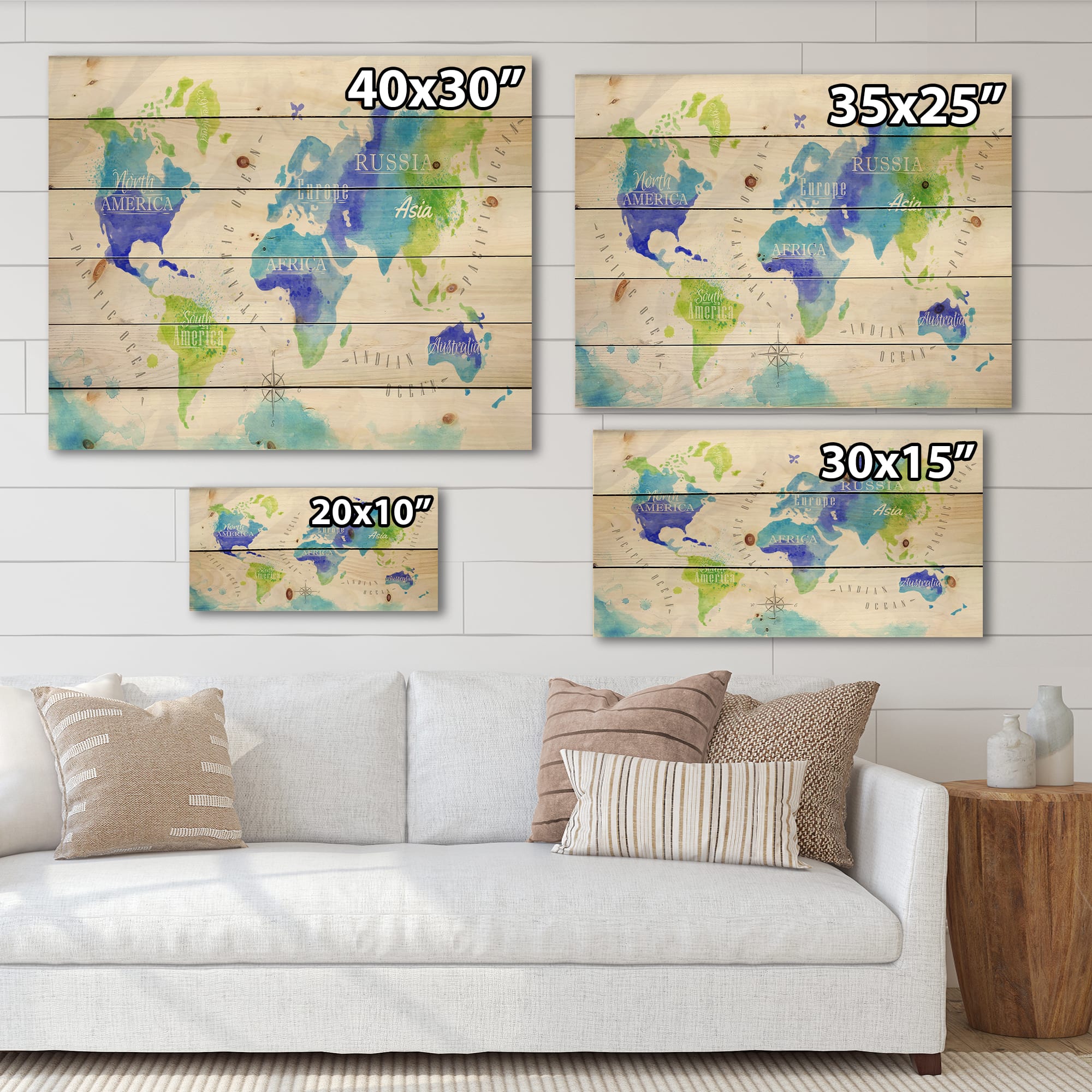 Designart - World Map In Green and Blue - Modern Print on Natural Pine Wood
