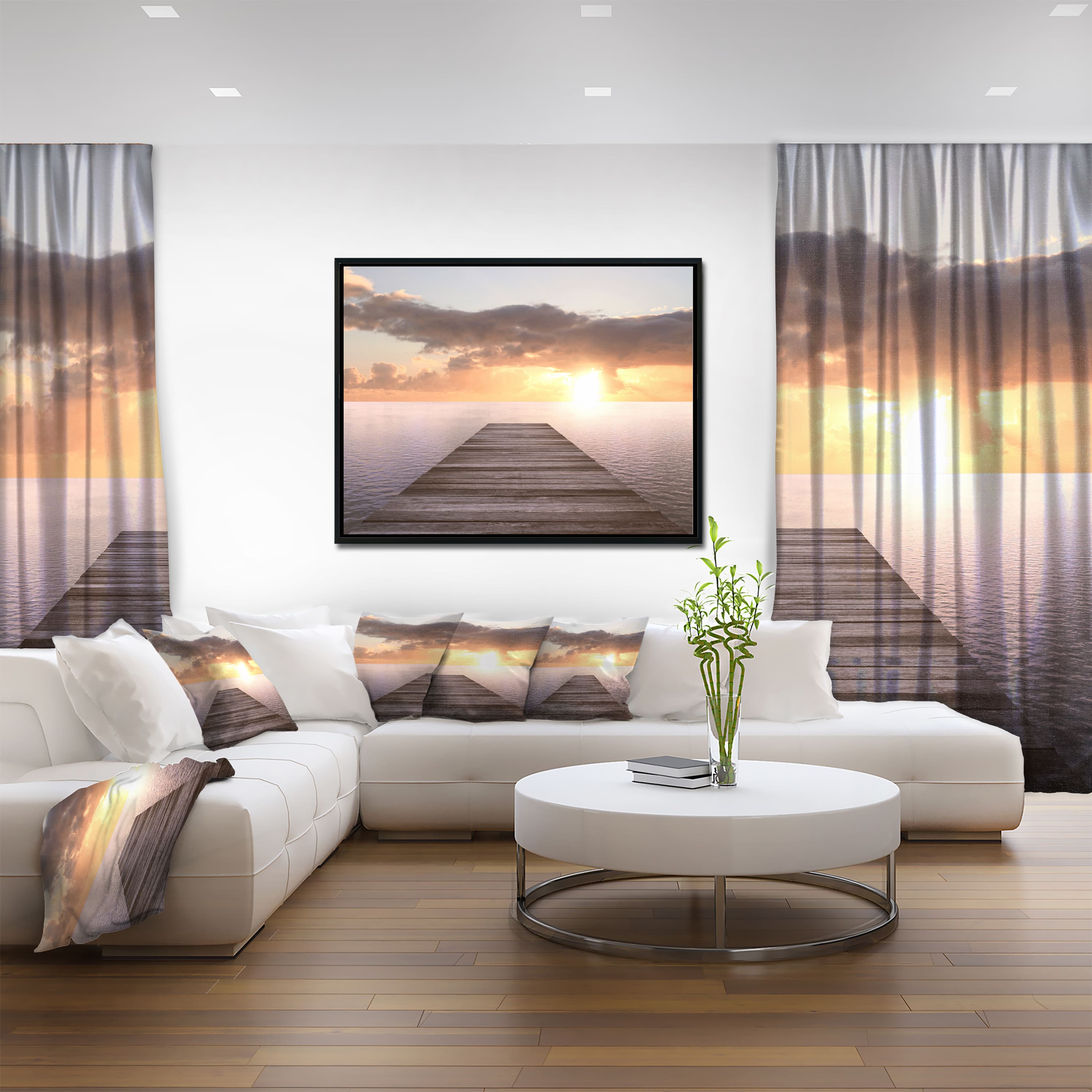 Designart - Yellow Sea and Brown Pier - Seascape Canvas Art Print in Black Frame