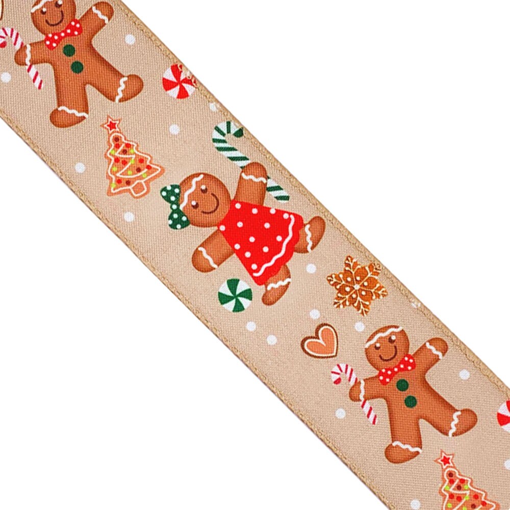Designer’ Shop WR 63-5220 Christmas Gingerbread Wired Edge Ribbon – 2.5" x 10 Yards – Tan Burlap with charming Gingerbread Candy Canes & Holiday Icons