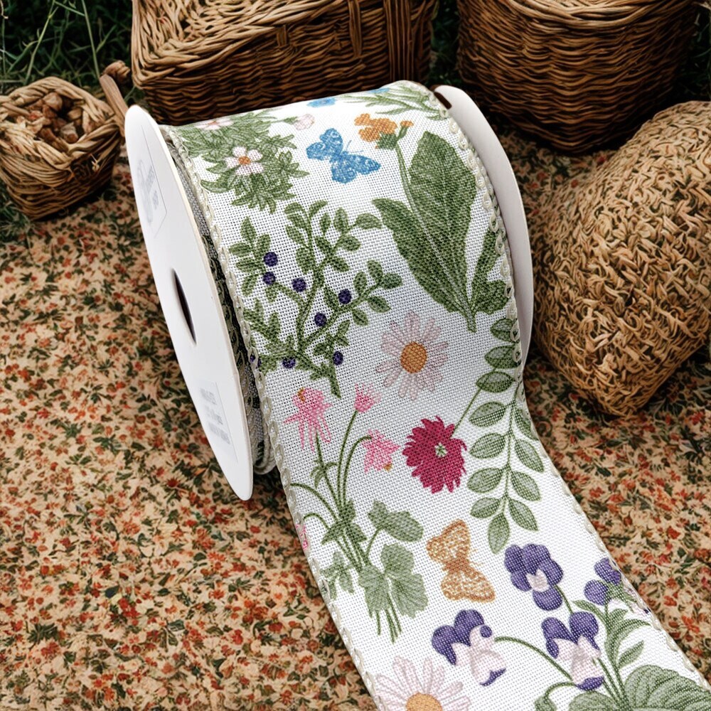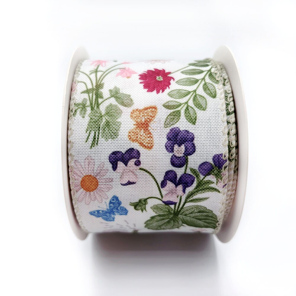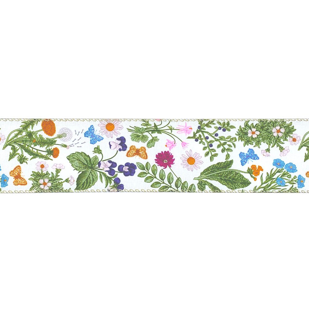 Designer’s Shop Botanical Wildflower Wired Ribbon 2.5 Inch x 10 Yards – Spring Floral & Butterfly Print on White Fabric WR 63-5231