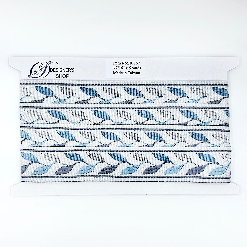 Designer’s Shop JL 767 Blue & Gray Leaf Woven Jacquard Trim – 1-7/16” x 5 Yards