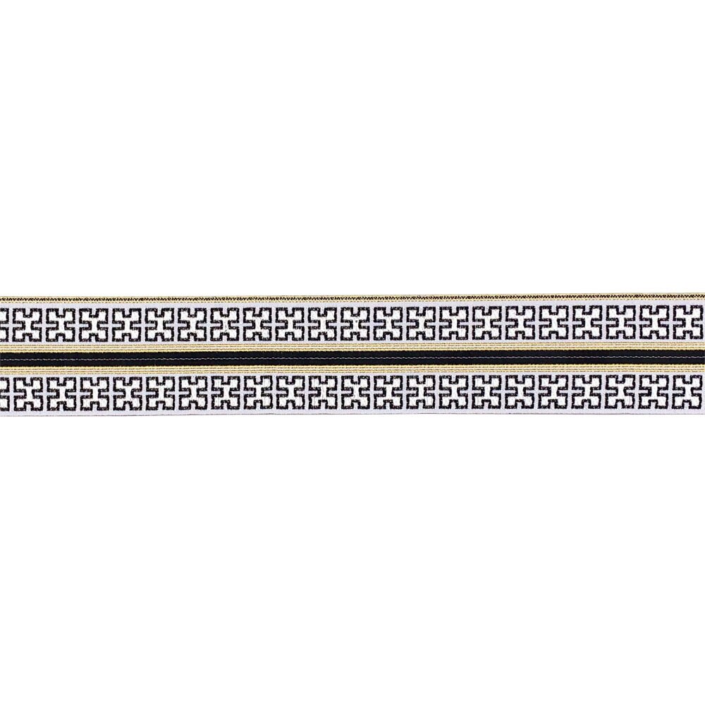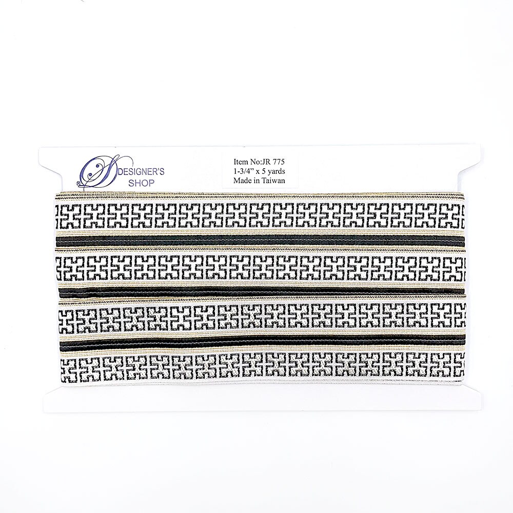 Designer’s Shop JR 775 Athena Key Luxe Jacquard Trim – 1-3/4” x 5 Yards – Black, White & Gold Woven Border