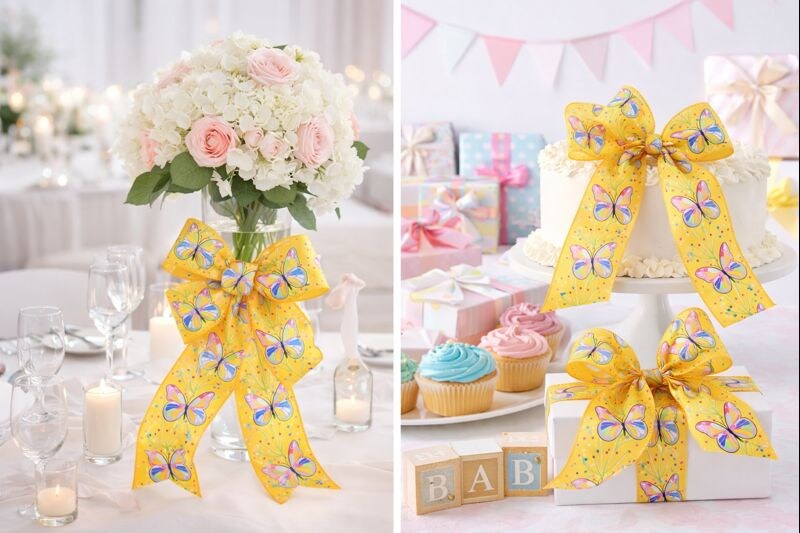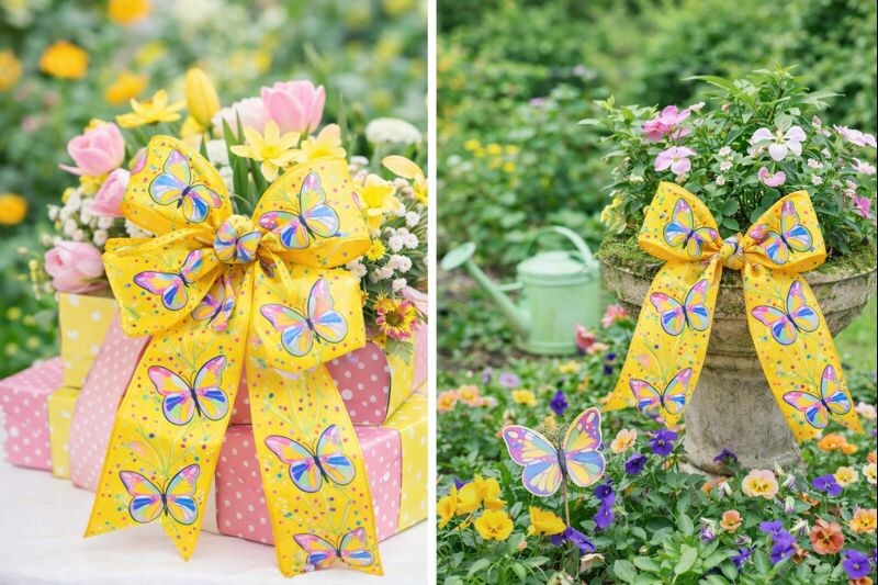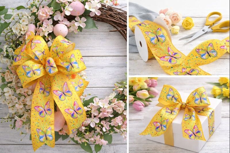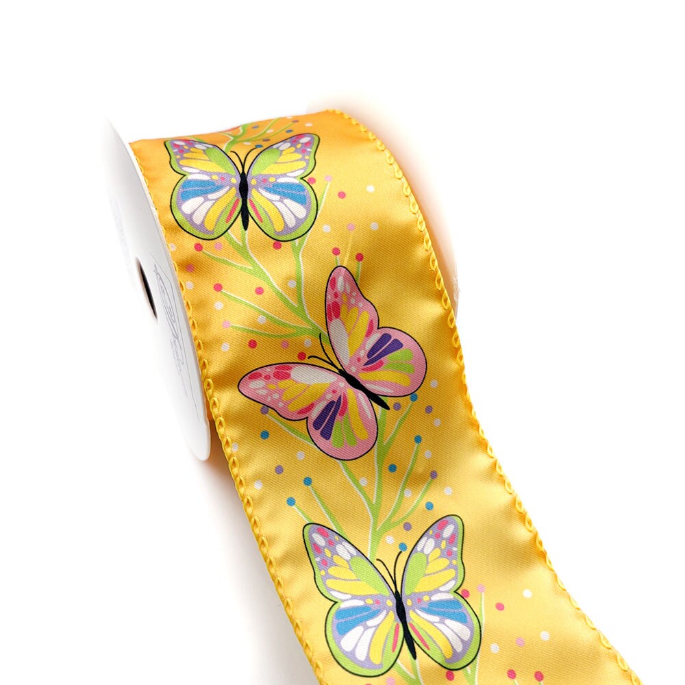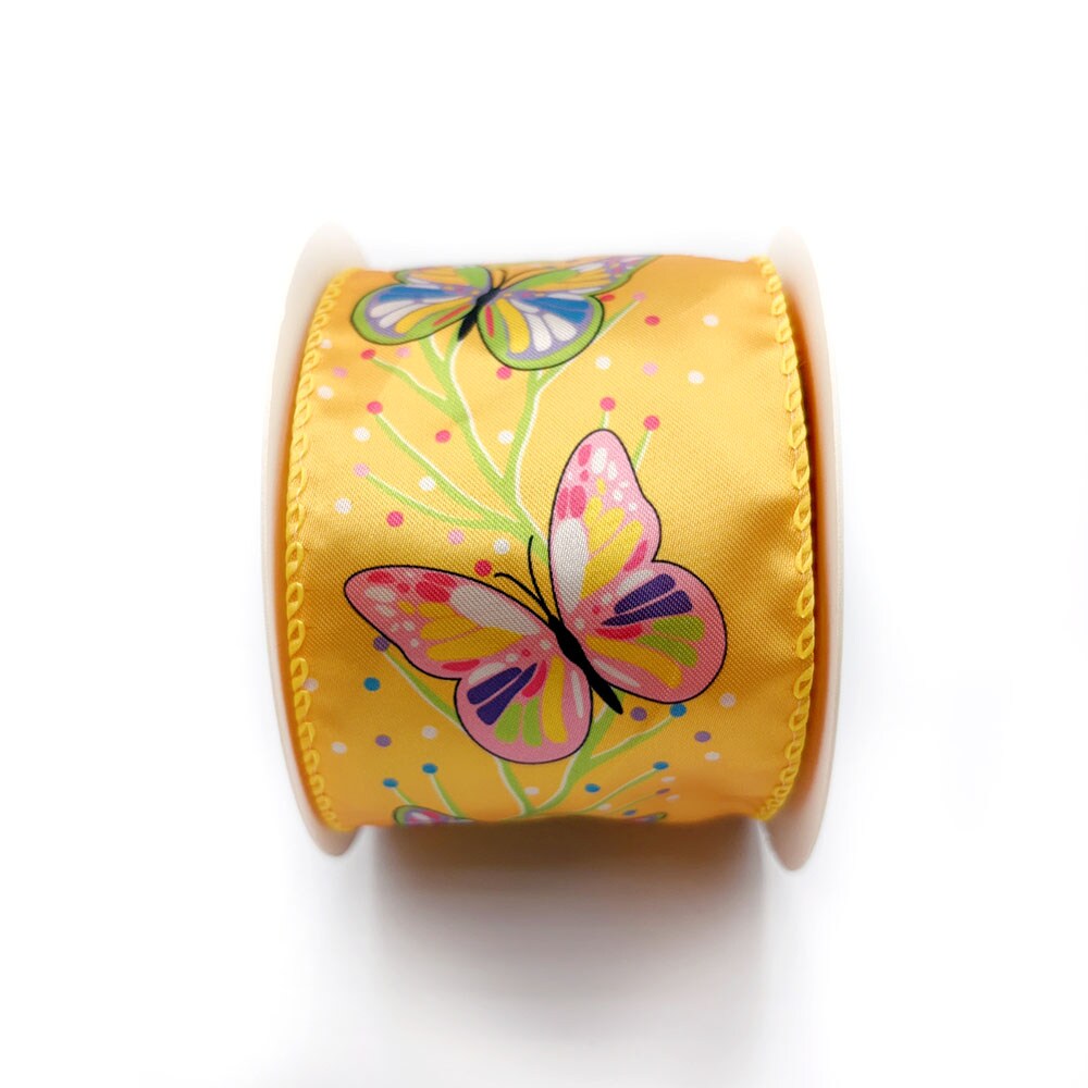 Designer’s Shop Spring Butterfly Wired Satin ribbon, 2.5 inch x 10 yards Yellow Floral Butterfly Print Decorative Ribbon. WR 63-5235