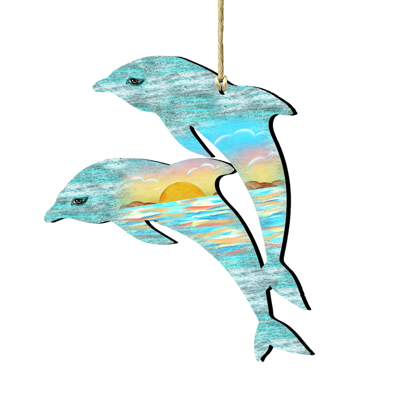 Designocracy Set of 2 Dolphins Beach Scene Wooden Christmas Ornaments 5.5"
