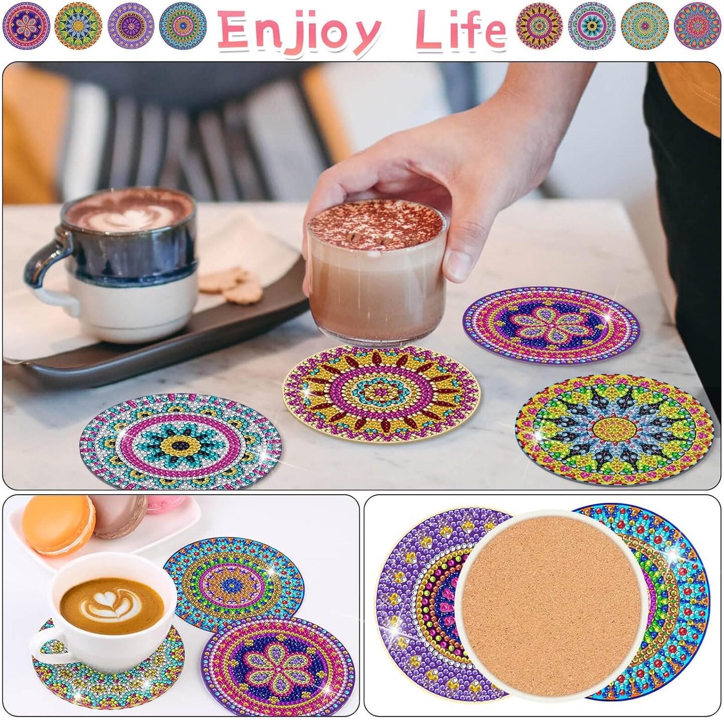 Diamond Art Painting Coasters Kit, 8 Pieces Mandala Diamond Art Coasters with Holder, DIY Diamond Mandala Coasters for Beginners, Kids