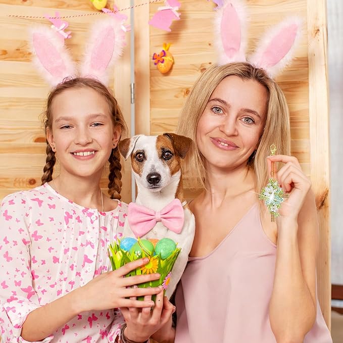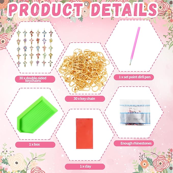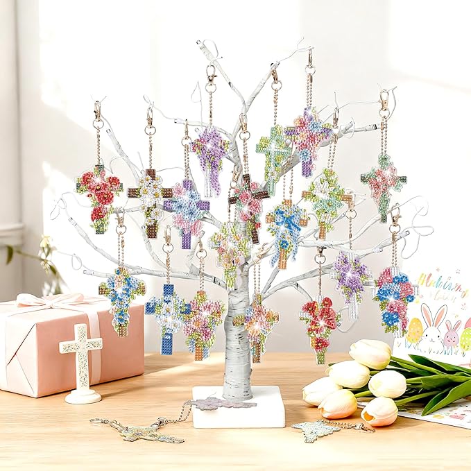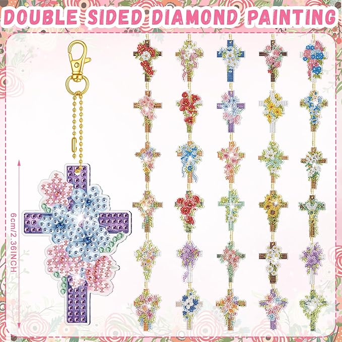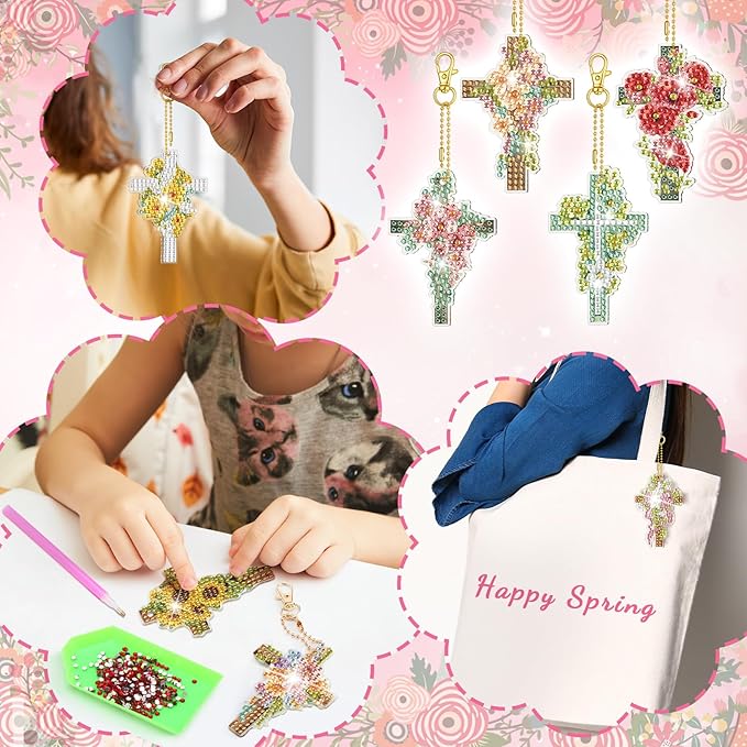 Diamond Art Sets for Adult, Christian Cross Spring Flower Diamond Painting Keychains Double Sided Diamonds Hanging Decoration for Beginners Craft and Religious Easter Gift