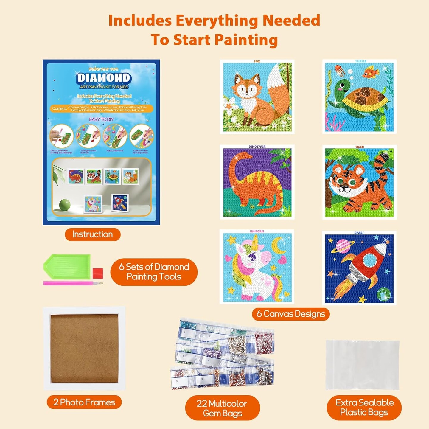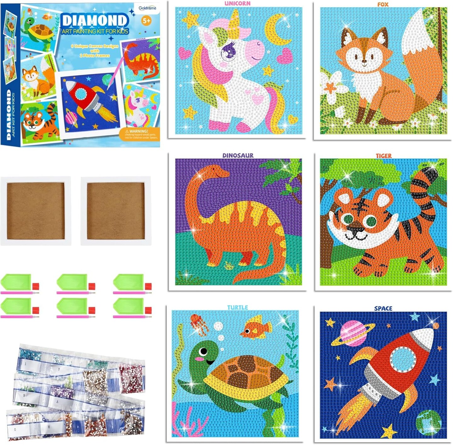 Diamond Painting Kits for Kids 6–12 – 6 Pack (6x6 Inch) with Unicorn, Dinosaur, Turtle & More – Gem Art Set with 21 Colors, Tools & Frames
