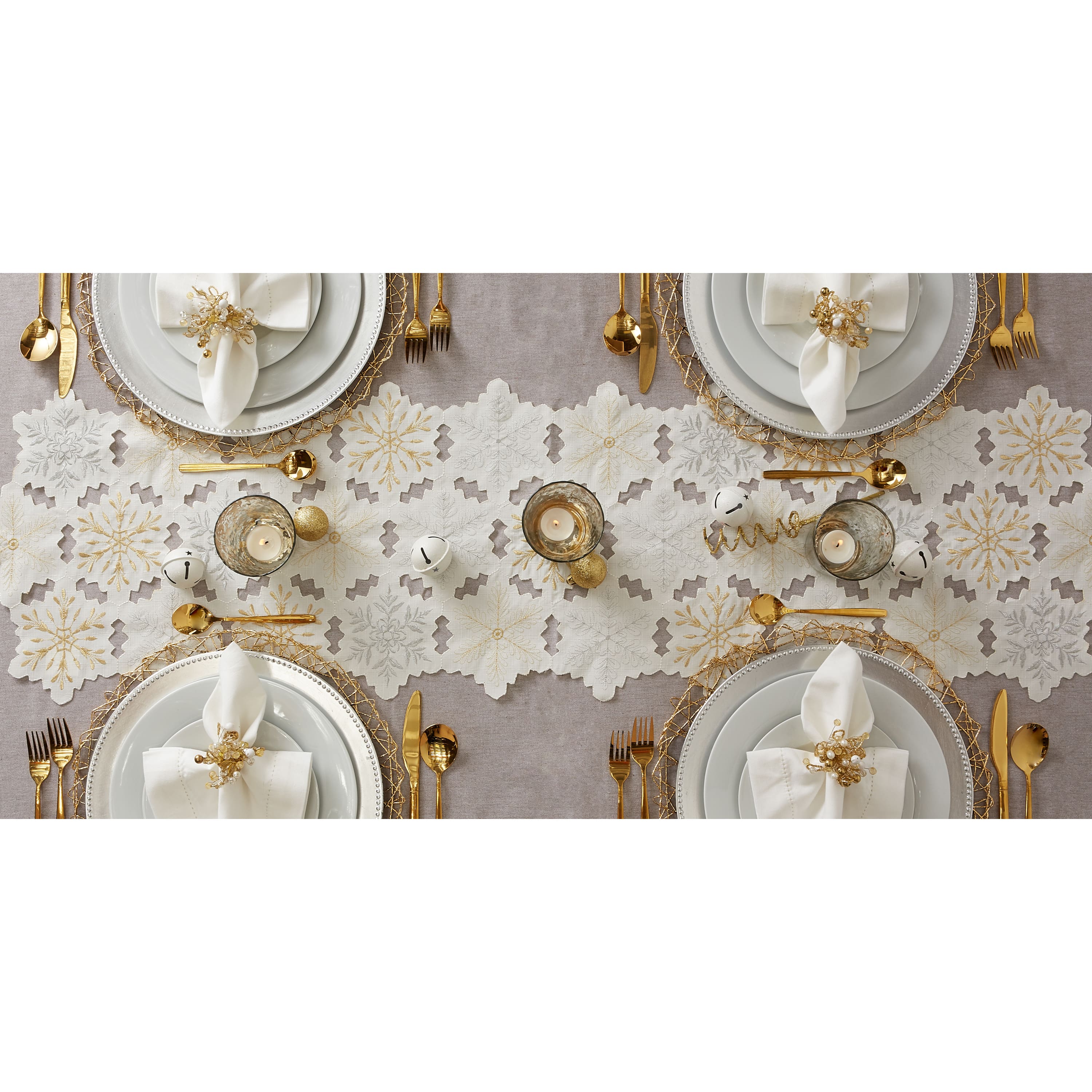 DII® 54" White and Gold Embroidered Snowflakes Table Runner