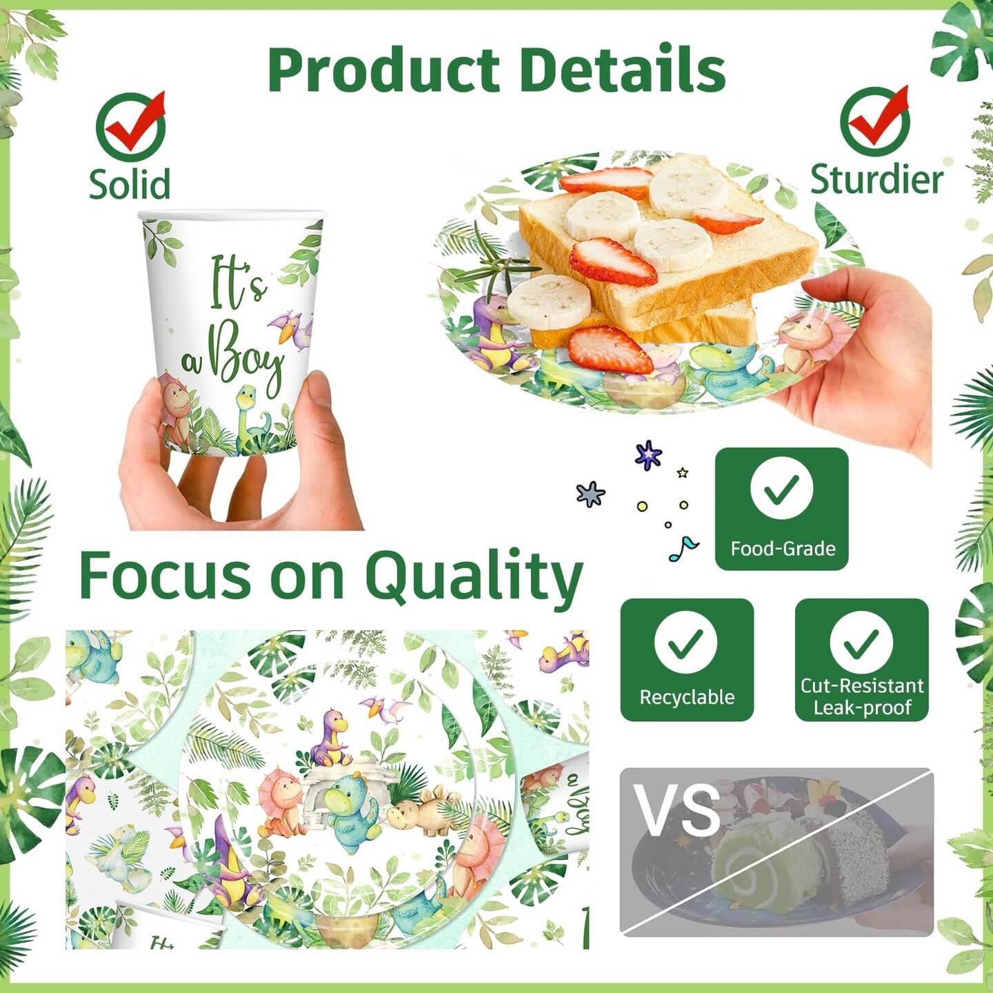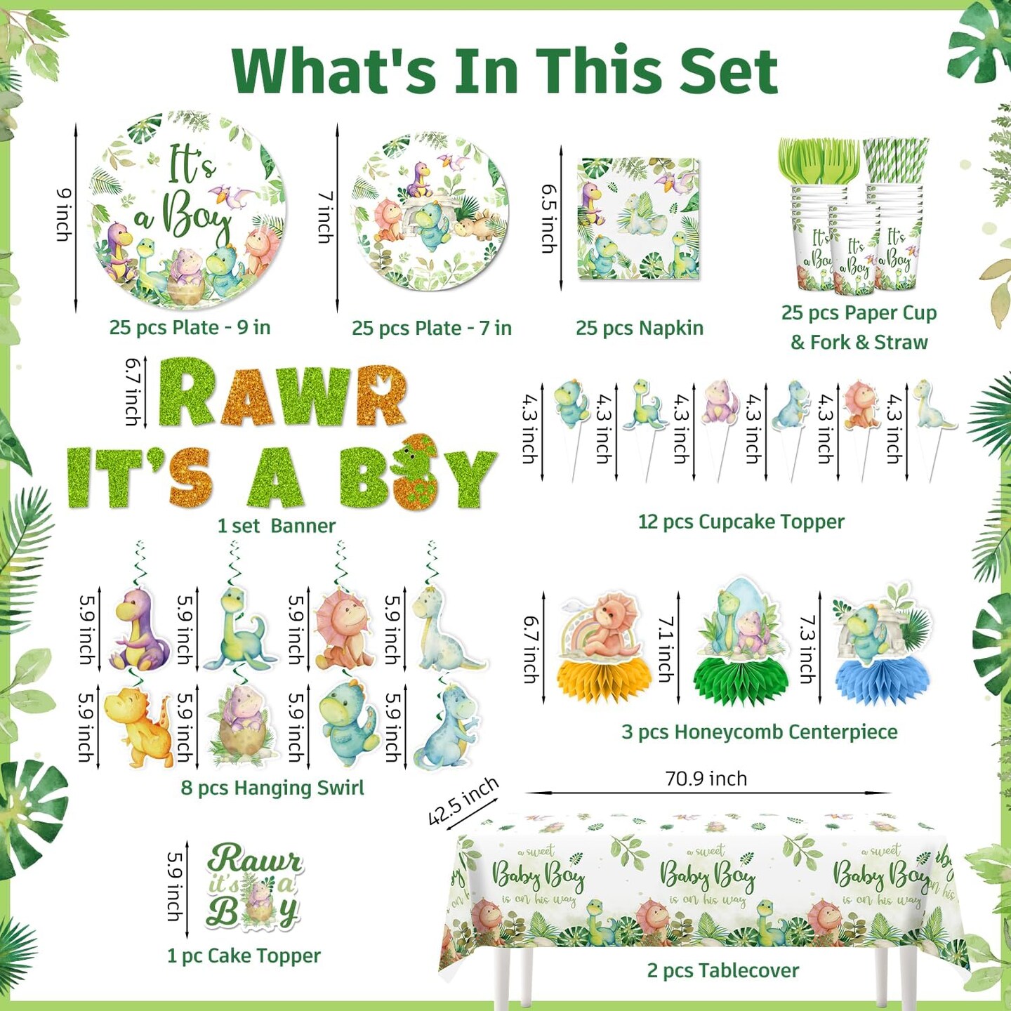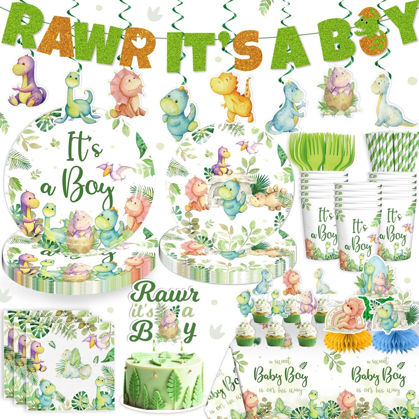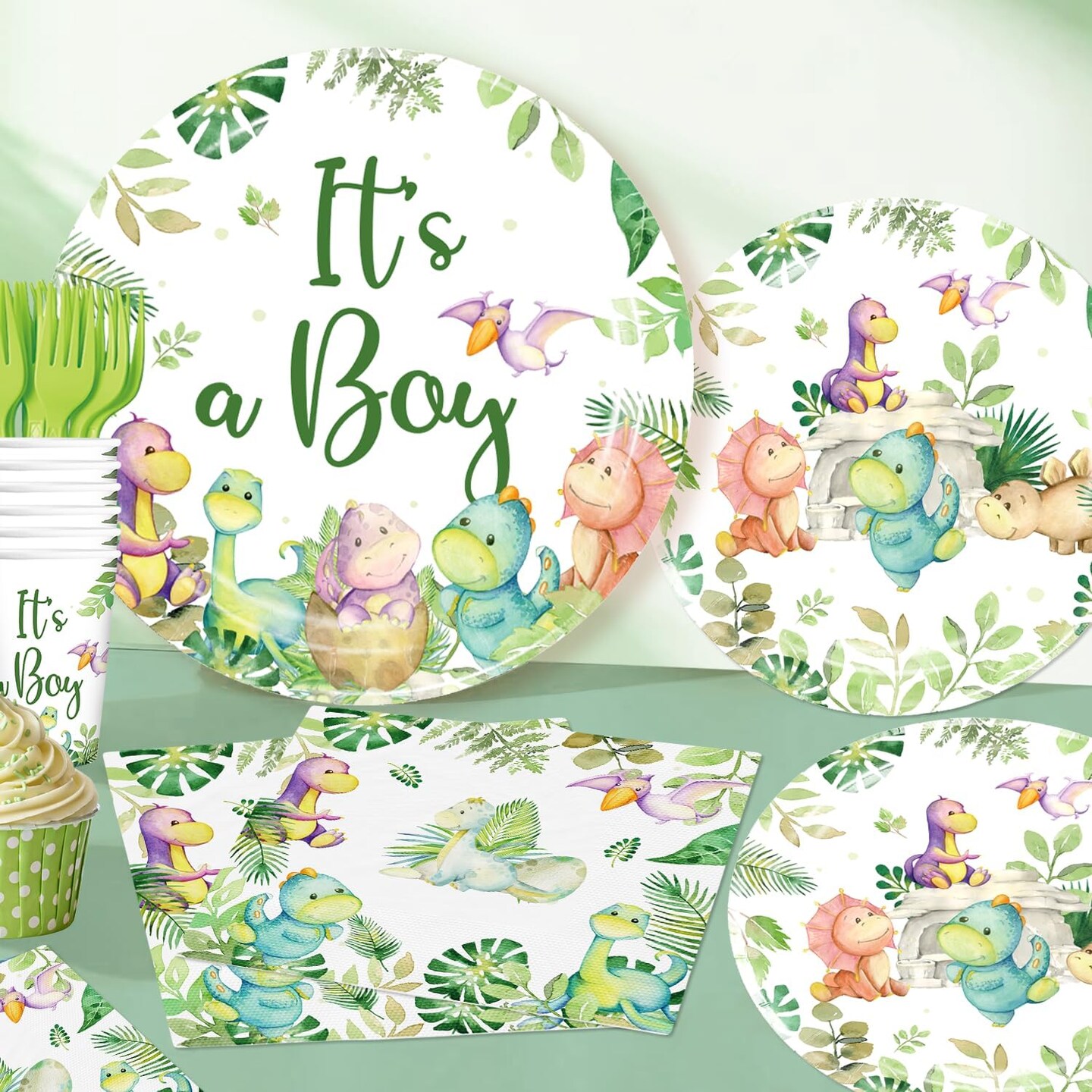 Dinosaur Baby Shower Decor Set – 25 Guests, Tableware & Cake Topper (Green)