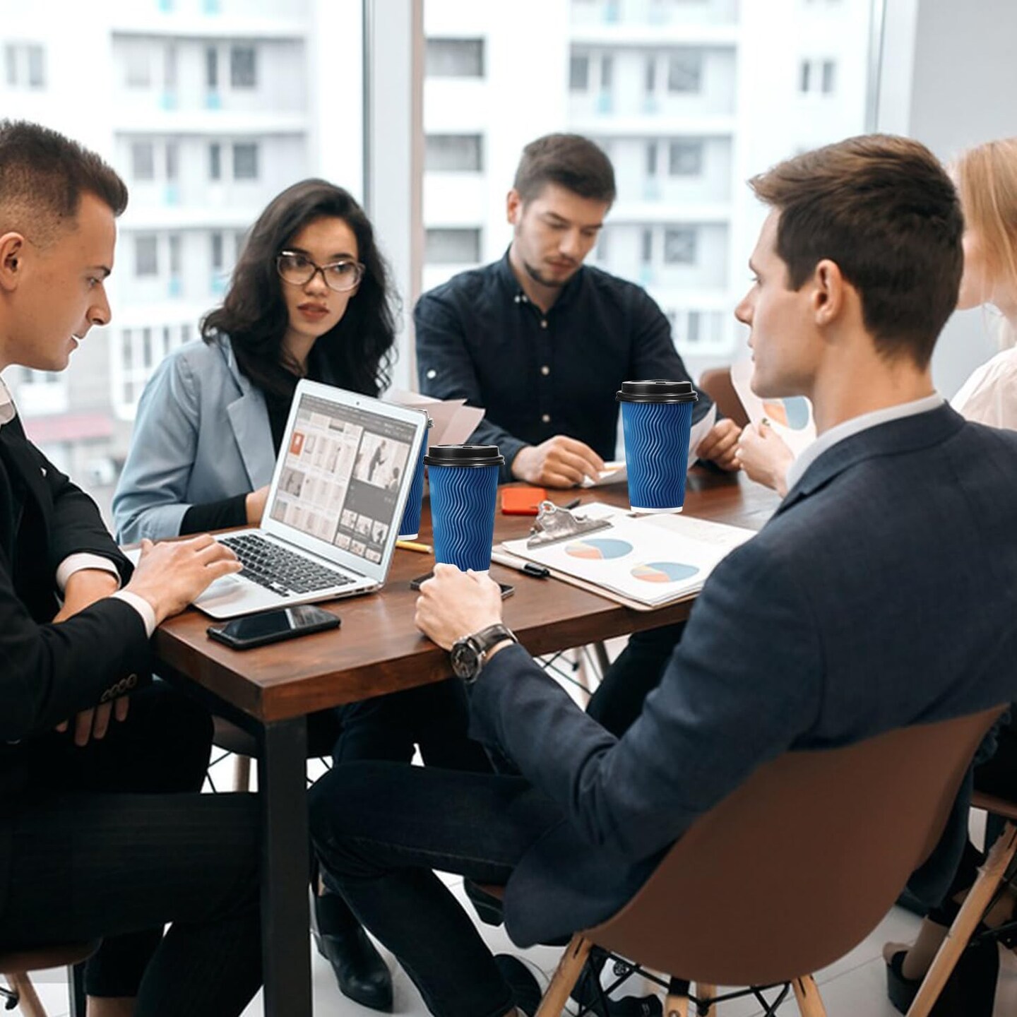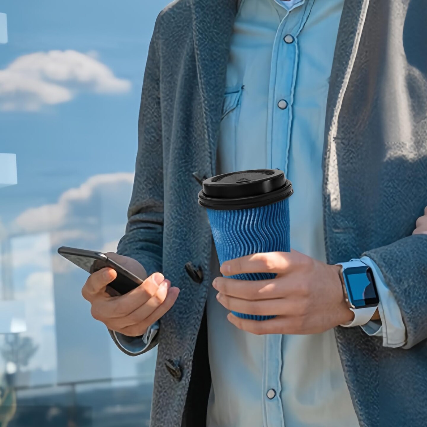 Disposable Coffee Cups with Lids 16 OZ 50 Pack, Insulated To Go Coffee Cups with Lids, Corrugated Ripple Wall Paper Coffee Cup with Lid for Hot Beverages (Blue)