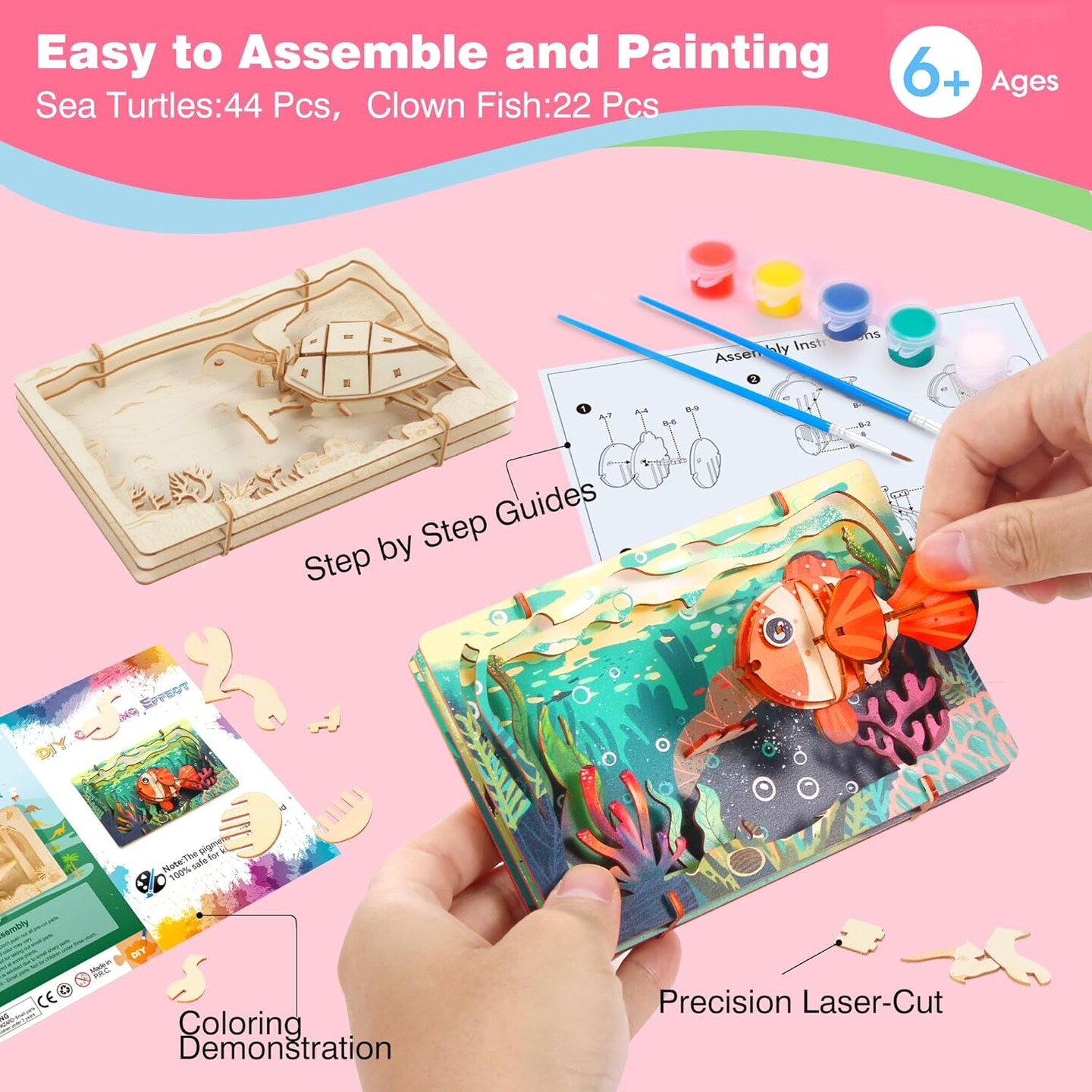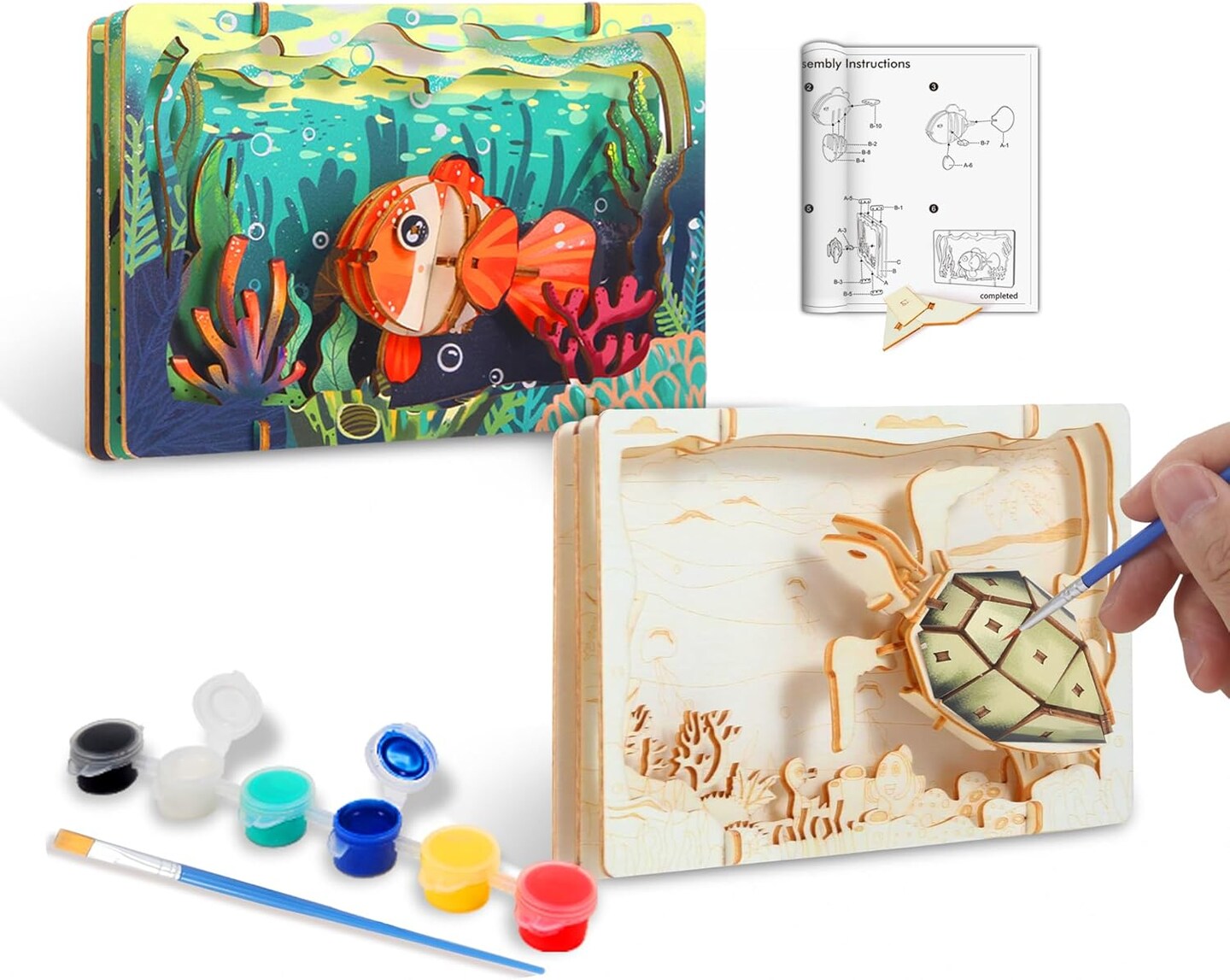 DIY Crafts Kit for Kids Build & Paint Your Own Wooden Craft - Sea Turtle, Fish with Unique Story Backdrop 2 Pack Wood Art Craft Set Painting Activity for Boy & Girl Ages 6 7 8 and Up