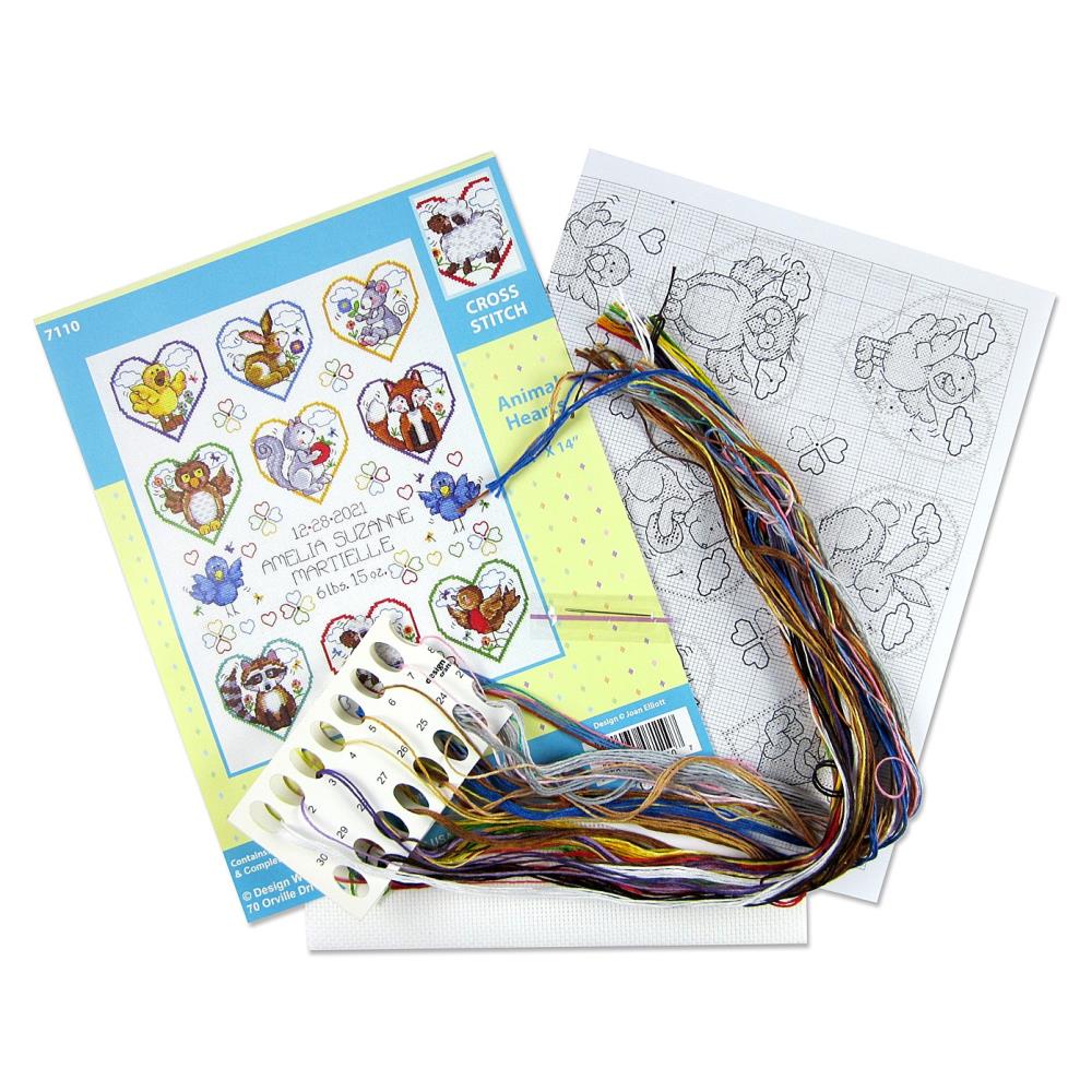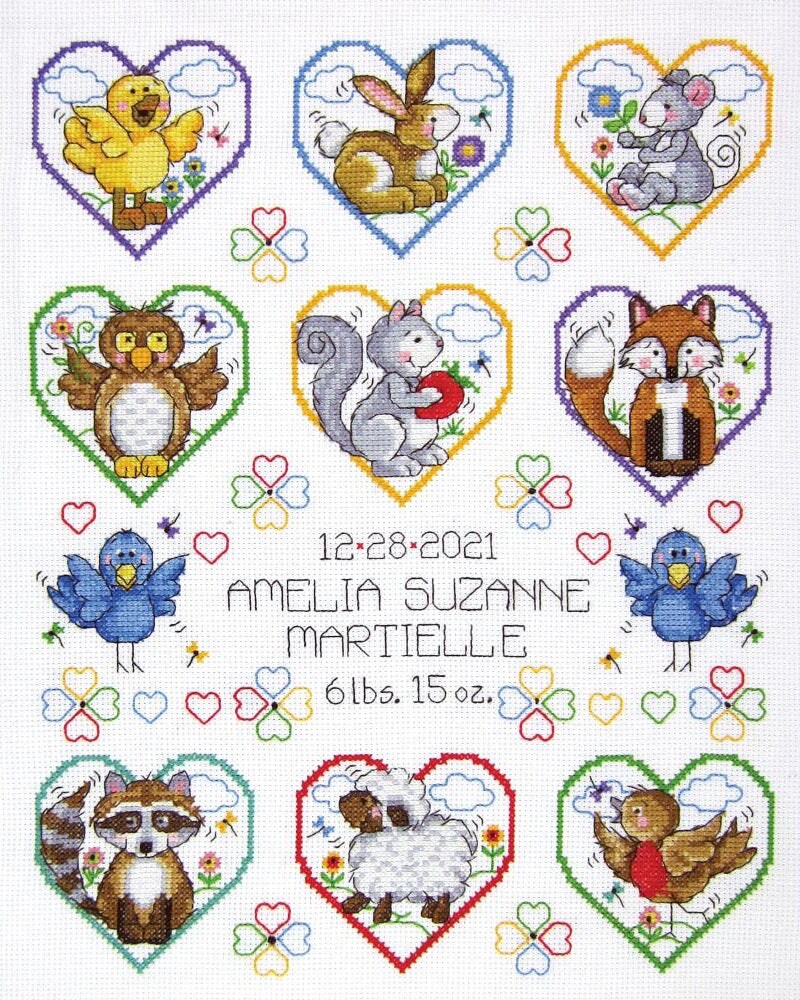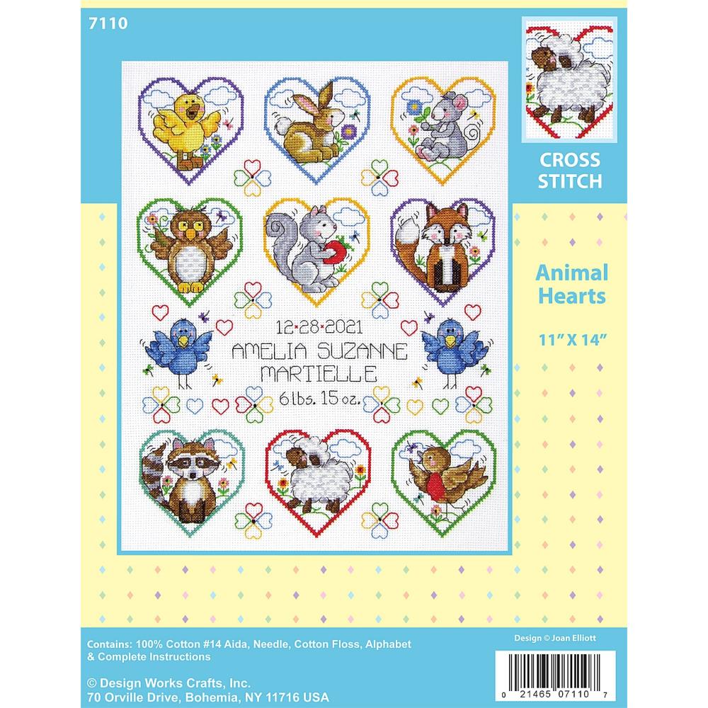 DIY Design Works Animal Hearts Baby Birth Record Counted Cross Stitch Kit 11x14