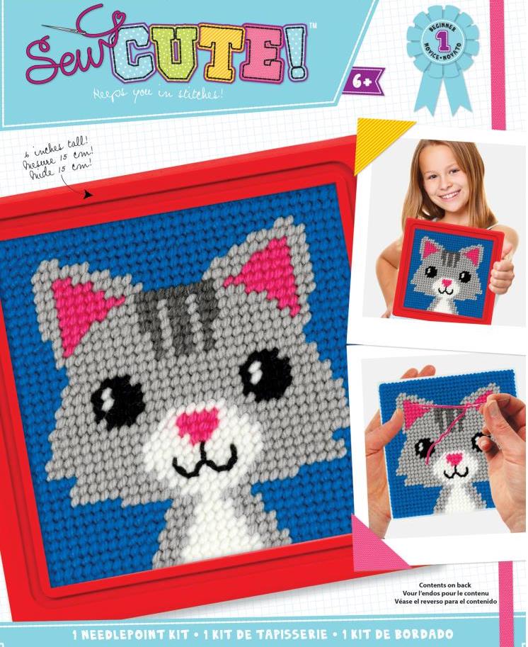 DIY Sew Cute Cat Kitten Kids Beginner Needlepoint Kit with Frame 6" x 6"