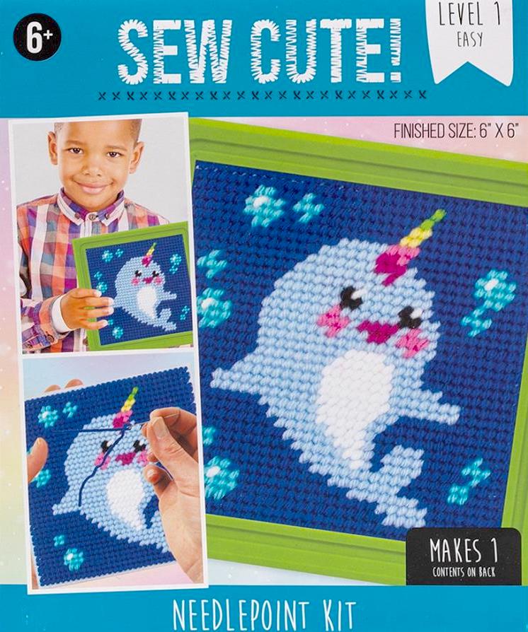 DIY Sew Cute Narwhal Dolphin Kids Beginner Needlepoint Kit w Frame 6"x6"
