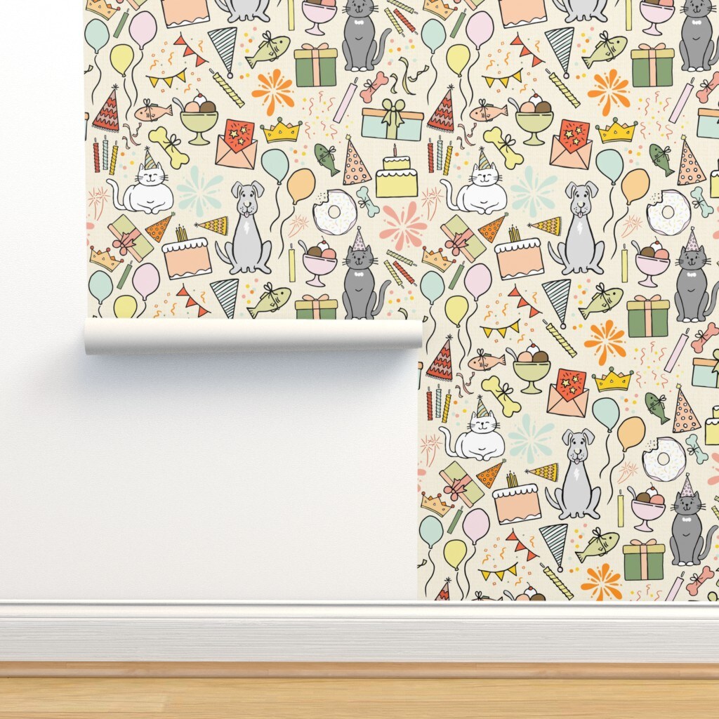 Dog Cat Multicolor Presents Whimsical Celebration Playful Balloons Pastels Candles Birthday Cake Bright Summer Colors Gift Large Scale Custom Pre-pasted Wallpaper by Spoonflower Pre-Pasted Wallpaper 2FT Wide
