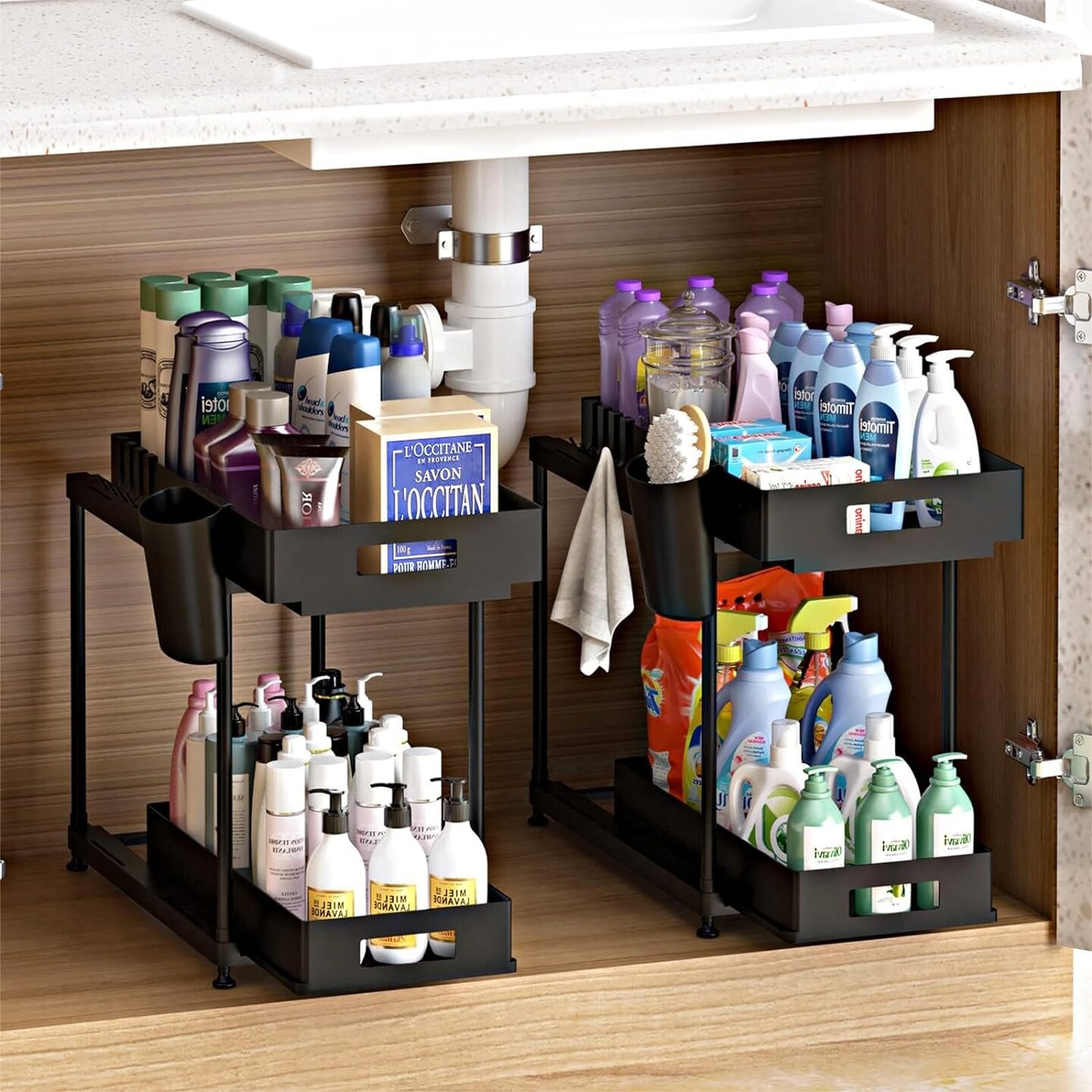 Double Sliding 2PC Under Sink Organizer, 2 Tier Bathroom Organizer with 2 Cup 8 Hooks, Multi-purpose Under Cabinet Storage Rack, Under Sink Organizers and Storage for Home Kitchen Organization