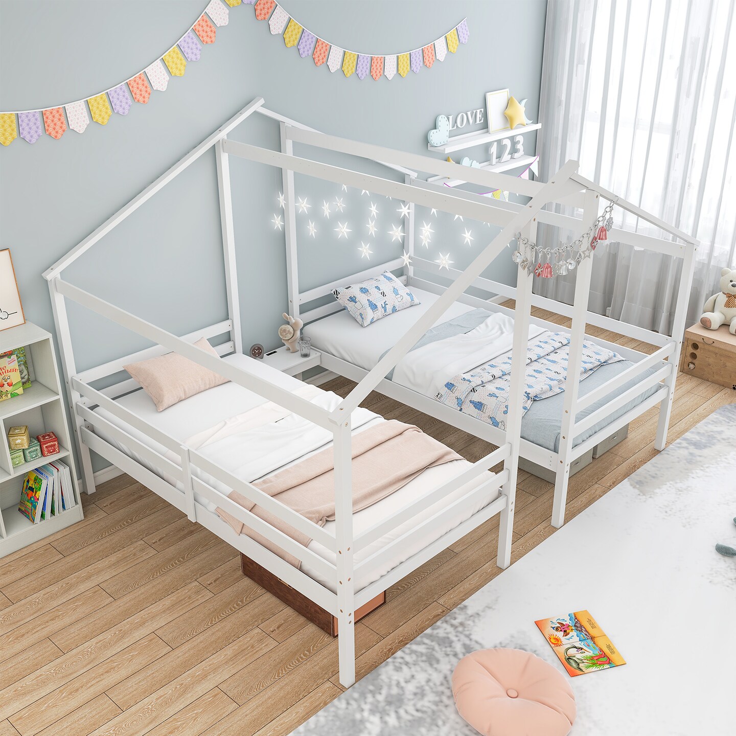 Double Twin Size Wooden Bed Frames with Built-in Table for Kids-White