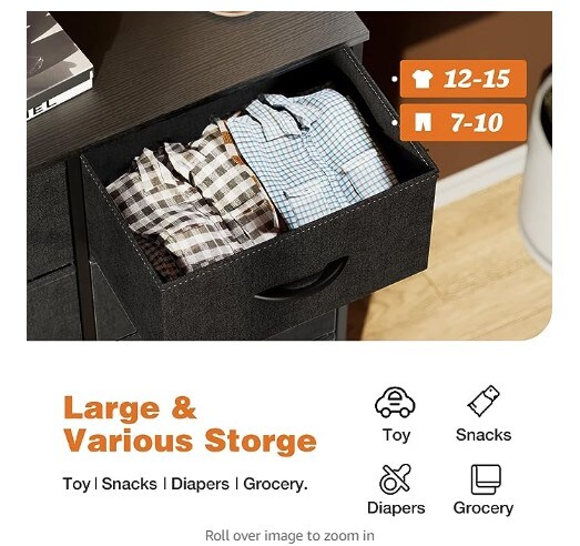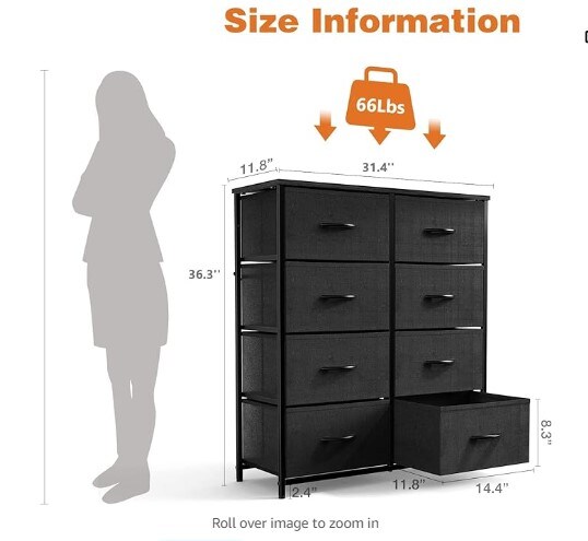 Dresser: Drawer Dresser for Bedroom Drawer Organizer: Steel Frame, Wood Top for Bedroom, Closet, and Entryway; Fabric Storage Tower with Eight Drawers; Chest of Drawers with Fabric Bins