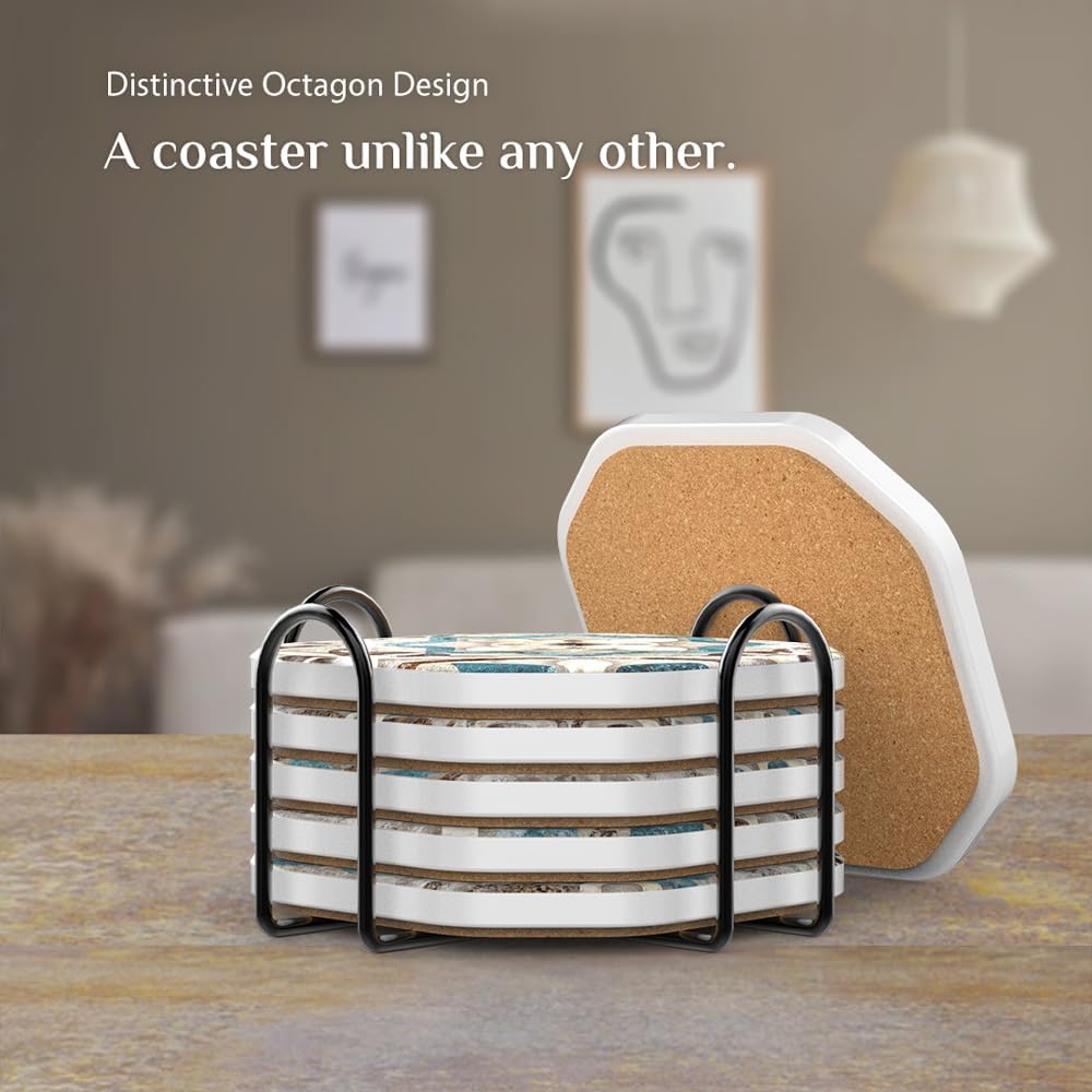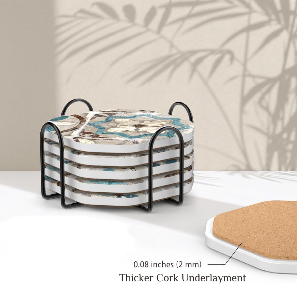 Drinks Coasters for Coffee Table Decor, Rustic Retro Boho Farmhouse Coasters, Absorbent Cup Mats for Wooden Table, Mandala Style, Unique Vintage Tile Design, Brown, 4", Set of 6